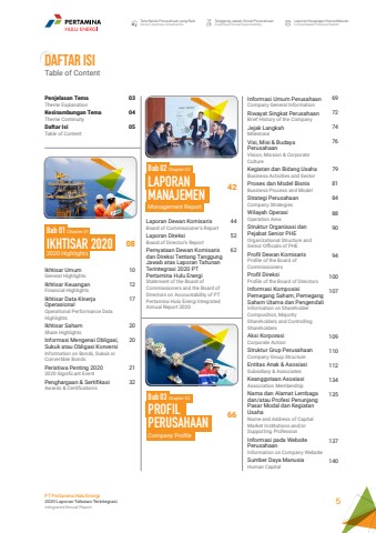 DAFTAR ISITable of ContentTata Kelola Perusahaan yang BaikGood Corporate GovernanceTanggung Jawab Sosial PerusahaanCorporate Social ResponsibilityLaporan Keuangan KonsolidasianConsolidated Financial ReportPT Pertamina Hulu Energi2020 Laporan Tahunan TerintegrasiIntegrated Annual Report 5Penjelasan TemaTheme ExplanationKesinambungan TemaTheme ContinuityDaftar IsiTable of ContentIkhtisar UmumGeneral HighlightsIkhtisar KeuanganFinancial HighlightsIkhtisar Data Kinerja OperasionalOperational Performance Data HighlightsIkhtisar SahamShare HighlightsInformasi Mengenai Obligasi, Sukuk atau Obligasi KonversiInformation on Bonds, Sukuk or Convertible BondsPeristiwa Penting 20202020 Significant EventPenghargaan & SertifikasiAwards & CertificationsLaporan Dewan KomisarisBoard of Commissioner%u2019s Report Laporan DireksiBoard of Director%u2019s Report Pernyataan Dewan Komisaris dan Direksi Tentang Tanggung Jawab atas Laporan Tahunan Terintegrasi 2020 PT Pertamina Hulu EnergiStatement of the Board of Commissioners and the Board of Directors on Accountability of PT Pertamina Hulu Energi Integrated Annual Report 2020Informasi Umum PerusahaanCompany General InformationRiwayat Singkat PerusahaanBrief History of the CompanyJejak LangkahMilestoneVisi, Misi & Budaya PerusahaanVision, Mission & Corporate CultureKegiatan dan Bidang UsahaBusiness Activities and SectorProses dan Model BisnisBusiness Process and ModelStrategi PerusahaanCompany StrategiesWilayah OperasiOperation AreaStruktur Organisasi dan Pejabat Senior PHEOrganizational Structure and Senior Officials of PHEProfil Dewan KomisarisProfile of the Board of CommissionersProfil DireksiProfile of the Board of DirectorsInformasi Komposisi Pemegang Saham, Pemegang Saham Utama dan PengendaliInformation on Shareholder Composition, Majority Shareholders and Controlling ShareholdersAksi KorporasiCorporate ActionStruktur Grup PerusahaanCompany Group StructureEntitas Anak & AsosiasiSubsidiary & AssociatesKeanggotaan AsosiasiAssociation MembershipNama dan Alamat Lembaga dan/atau Profesi Penunjang Pasar Modal dan Kegiatan UsahaName and Address of Capital Market Institutions and/or Supporting ProfessionInformasi pada Website PerusahaanInformation on Company WebsiteSumber Daya ManusiaHuman Capital0304051012172020213244526269727476798184889094100107109110112134135137140Bab 01 Chapter 01IKHTISAR 20202020 Highlights084266Bab 02 Chapter 02Bab 03 Chapter 03LAPORAN MANAJEMENPROFIL PERUSAHAANManagement ReportCompany Profile