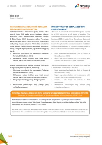 INTEGRITY PACT OF COMPLIANCE WITH CODE OF CONDUCTThe Code of Conduct & Business Ethics (COC) applies to all PHE personnel at all levels of position. The commitment to implement the Code of Conduct & Ethics Business (COC) is stated in a Compliance Statement which must be updated annually by employees and PHE leaders through an online compliance system. In addition to filling out a statement of compliance, every worker in the PHE environment also has the responsibility of:%u2022 Read, understand and apply the Code of Conduct & Ethics Business (COC). %u2022 Report any actions that are not in accordance with the laws and provisions of other companies.The responsibilities as head of PHE apart from filling out a statement of compliance, it includes:%u2022 Read, understand and apply the Code of Conduct & Ethics Business (COC);%u2022 Report any actions that are not in accordance with the laws and other Company provisions.%u2022 Become a role model for workers in their environment.%u2022 Memberikan perlindungan bagi pekerja yang melakukan pelaporan.PAKTA INTEGRITAS KEPATUHAN TERHADAPPEDOMAN PERILAKU DAN ETIKAPedoman Perilaku & Etika Bisnis (COC) berlaku untuk seluruh Insan PHE pada semua tingkatan jabatan. Komitmen untuk melaksanakan Pedoman Perilaku & Etika Bisnis (COC) dinyatakan dalam Pernyataan Kepatuhan yang setiap tahun yang harus diperbaharui oleh pekerja maupun pimpinan PHE melalui compliance online system. Selain mengisi pernyataan kepatuhan, setiap pekerja di lingkungan PHE juga memiliki tanggung jawab:%u2022 Membaca, memahami, dan menerapkan Pedoman Perilaku & Etika Bisnis (COC);%u2022 Melaporkan setiap tindakan yang tidak sesuai dengan hukum dan ketentuan Perusahaan lain.Adapun tanggung jawab sebagai pimpinan PHE selain mengisi pernyataan kepatuhan, mencakup:%u2022 Membaca, memahami, dan menerapkan Pedoman Perilaku & Etika Bisnis (COC).%u2022 Melaporkan setiap tindakan yang tidak sesuai dengan hukum dan ketentuan Perusahaan lainnya. %u2022 Menjadi panutan bagi pekerja di lingkungannya.%u2022 Memberikan perlindungan bagi pekerja yang melakukan pelaporan.Pernyataan Kepatuhan Direksi dan Dewan Komisaris Terhadap Pedoman Perilaku & Etika Bisnis (COC) PHEStatement of Compliance with Board of Directors and Board of Commissioners of PHE%u2019s CodeKami bersepakat bahwa PT Pertamina Hulu Energi dalam menjalankan kegiatannya senantiasa harus sesuai dengan prinsip-prinsip Tata Kelola Perusahaan yang Baik. Komitmen ini diwujudkan melalui Tata Nilai Perusahaan dan Pedoman Perilaku & Etika Bisnis.We agree that PT Pertamina Hulu Energi has to adhere to the principles of Good Corporate Governance in carrying out its activities. This commitment was realized through the Corporate Value and Code of Conduct & Business EthicsKode etikCode of ConductLaporan ManajemenManagement ReportProfil PerusahaanCompany ProfileAnalisa & Diskusi ManajemenManagement Discussion & AnalysisIkhtisar 20202020 HighlightsPT Pertamina Hulu Energi2020 Laporan Tahunan TerintegrasiIntegrated Annual Report 504