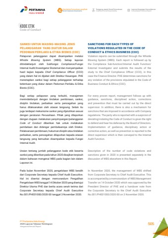 SANCTIONS FOR EACH TYPES OF VIOLATIONS REGULATED IN THE CODE OF CONDUCT & ETHICS BUSINESS (COC)Violation reports can be submitted through the Whistle Blowing System (WBS). Each report is followed up by the Compliance Sub-function/Internal Audit Function/External Investigator and submits the results of the study to the Chief Compliance Officer (CCO), in this case the Finance Director. PHE determines sanctions for any violation of the provisions stipulated in the Code of Business Conduct & Ethics (COC).For every proven report, management follows up with guidance, sanctions, disciplined action, corrections and prevention that must be carried out by the direct supervisor. In addition, there is also a mechanism for sanctions that are imposed in accordance with Company regulations. The party who is reported with a suspicion of deviating/violating the Code of Conduct is given the right to defend and hear his defense by the Board of Directors. Implementation of guidance, disciplinary action or corrective action, as well as prevention is reported to the direct supervisor which is then conveyed to the Internal Audit Function.Description of the number of code violations and sanctions given in 2020 is presented separately in the discussion of WBS elsewhere in this Report.In November 2020, the management of WBS shifted from Corporate Secretary to Chief Audit Execuitive. This is accompanied by a memorandum of WBS Management Transfer on 14 October 2020 which was approved by the President Director of PHE and a handover note from the Corporate Secretary to the Chief Audit Execuitive No.001/PHE01000/2020-S0 on 3 November 2020.SANKSI UNTUK MASING-MASING JENIS PELANGGARAN YANG DIATUR DALAM PEDOMAN PERILAKU & ETIKA BISNIS (COC)Pelaporan pelanggaran dapat disampaikan melalui Whistle Blowing System (WBS). Setiap laporan ditindaklanjuti oleh Subfungsi Compliance/Fungsi Internal Audit/Investigator Eksternal dan menyampaikan hasil kajian kepada Chief Compliance Officer (CCO) yang dalam hal ini dijabat oleh Direktur Keuangan. PHE menetapkan sanksi bagi setiap pelanggaran terhadap ketentuan yang diatur dalam Pedoman Perilaku & Etika Bisnis (COC).Bagi setiap pelaporan yang terbukti, manajemen menindaklanjuti dengan tindakan pembinaan, sanksi, disiplin tindakan, perbaikan serta pencegahan yang harus dilaksanakan oleh atasan langsung. Selain itu juga terdapat mekanisme sanksi yang dijatuhkan sesuai dengan peraturan Perusahaan. Pihak yang dilaporkan dengan dugaan melakukan penyimpangan/pelanggaran Code of Conduct diberikan hak untuk melakukan pembelaan dan didengar pembelaannya oleh Direksi. Pelaksanaan pembinaan, hukuman disiplin atau tindakan perbaikan, serta pencegahan dilaporkan kepada atasan langsung yang kemudian disampaikan kepada Fungsi Internal Audit.Uraian tentang jumlah pelanggaran kode etik beserta sanksi yang diberikan pada tahun 2020 disajikan terpisah dalam bahasan mengenai WBS pada bagian lain dalam Laporan ini.Pada bulan November 2020, pengelolaan WBS beralih dari Corporate Secretary kepada Chief Audit Execuitive. Hal ini disertai dengan memorandum Pengalihan Pengelolaan WBS tanggal 14 Oktober 2020 yang disetujui Direktur Utama PHE dan berita acara serah terima dari Corporate Secretary kepada Chief Audit Execuitive No.001/PHE01000/2020-S0 tanggal 3 November 2020.Kode etikCode of ConductTata Kelola Perusahaan yang BaikGood Corporate GovernanceTanggung Jawab Sosial PerusahaanCorporate Social ResponsibilityLaporan Keuangan KonsolidasianConsolidated Financial ReportPT Pertamina Hulu Energi2020 Laporan Tahunan TerintegrasiIntegrated Annual Report 505