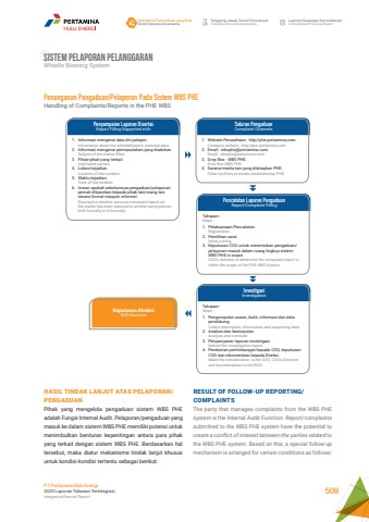 RESULT OF FOLLOW-UP REPORTING/ COMPLAINTSThe party that manages complaints from the WBS PHE system is the Internal Audit Function. Report/complaints submitted to the WBS PHE system have the potential to create a conflict of interest between the parties related to the WBS PHE system. Based on this, a special follow-up mechanism is arranged for certain conditions as follows:Penanganan Pengaduan/Pelaporan Pada Sistem WBS PHEHandling of Complaints/Reports in the PHE WBSPenyampaian Laporan Disertai:Report Filling Supported with:Pencatatan Laporan PengaduanReport/Complaint FillingInvestigasiInvestigationSaluran PengaduanComplaint Channels1. Informasi mengenai data diri pelapor.Information about the whistleblower's personal data.2. Informasi mengenai permasalahan yang diadukan.Subject of the matter filled.3. Pihak-pihak yang terkait.Implicated parties.4. Lokasi kejadian.Location of the incident.5. Waktu kejadian.Time of the incident.6. Uraian apakah sebelumnya pengaduan/pelaporan pernah dilaporkan kepada pihak lain/orang lain secara formal maupun informal.Description whether previous complaint/report on the matter has been reported to another party/person both formally or in-formally.Tahapan :Steps :1. Pelaksanaan Pencatatan.Registration.2. Pemilihan awal.Initial sorting.3. Keputusan COO untuk menentukan pengaduan/pelaporan masuk dalam ruang lingkup sistem WBS PHE in scope.COO's decision to determine the complaint/report is within the scope of the PHE WBS System.Tahapan :Steps :1. Pengumpulan uraian, bukti, informasi dan data pendukung.Collect description, information and supporting data.2. Analisis dan kesimpulan.Analysis and conclude.3. Penyampaian laporan investigasi.Submit the investigation report.4. Pemberian pertimbangan kepada COO, keputusan COO dan rekomendasi kepada Direksi.Make the consideration tu the COO, COO's Decision and recomendation to the BOD.1. Website Perusahaan : http//phe.pertamina.com.Company website : http//phe.pertamina.com.2. Email : wbsphe@pertamina.com.Email : wbsphe@pertamina.com.3. Drop Box : WBS PHE.Drop Box WBS PHE.4. Sarana/media lain yang ditetapkan PHE.Other facilities or media established by PHE.Keputusan DireksiBOD DecisionHASIL TINDAK LANJUT ATAS PELAPORAN/PENGADUANPihak yang mengelola pengaduan sistem WBS PHE adalah Fungsi Internal Audit. Pelaporan/pengaduan yang masuk ke dalam sistem WBS PHE memiliki potensi untuk menimbulkan benturan kepentingan antara para pihak yang terkait dengan sistem WBS PHE. Berdasarkan hal tersebut, maka diatur mekanisme tindak lanjut khusus untuk kondisi-kondisi tertentu sebagai berikut:Sistem Pelaporan pelanggaranWhistle Blowing SystemTata Kelola Perusahaan yang BaikGood Corporate GovernanceTanggung Jawab Sosial PerusahaanCorporate Social ResponsibilityLaporan Keuangan KonsolidasianConsolidated Financial ReportPT Pertamina Hulu Energi2020 Laporan Tahunan TerintegrasiIntegrated Annual Report 509