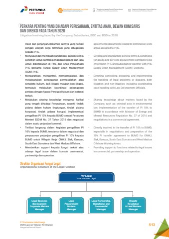 agreements/documents related to termination work areas assigned to PHE.%u2022 Develop and standardize general terms & conditions for goods and services procurement contracts to be enforced in PHE and Subsidiaries together with PHE Supply Chain Management (SCM) Functions.%u2022 Directing, controlling, preparing, and implementing the handling of legal problems or disputes, both litigation and non-litigation, including coordinating case handling with Law Enforcement Officials. %u2022 Sharing knowledge about matters faced by the Company, such as: criminal acts in environmental law, implementation of the transfer of PI 10% to BUMD in accordance with Minister of Energy and Mineral Resources Regulation No. 37 of 2016 and negotiations in a commercial agreement. %u2022 Directly involved in the transfer of PI 10% to BUMD, especially in negotiations and preparation of the 10% PI transfer agreement to BUMD for ONWJ, Siak, Kampar, South East Sumatra and West Madura Offshore Working Areas. %u2022 Providing support to functions related to legal issues in commercial, partnership and operation.Hasil dan perjanjian/dokumen lainnya yang terkait dengan wilayah kerja terminasi yang ditugaskan kepada PHE.%u2022 Menyusun dan membuat standarisasi general term & condition untuk kontrak pengadaan barang dan jasa untuk diberlakukan di PHE dan Anak Perusahaan PHE bersama Fungsi Supply Chain Management(SCM) PHE.%u2022 Mengarahkan, mengontrol, mempersiapkan, dan melaksanakan penanganan permasalahan atau sengketa hukum, baik litigasi maupun non litigasi, termasuk melakukan koordinasi penanganan perkara dengan Aparat Penegak Hukum dan instansi terkait.%u2022 Melakukan sharing knowledge mengenai hal-hal yang tengah dihadapi Perusahaan, seperti: tindak pidana dalam hukum lingkungan, tindak pidana korporasi, tindak pidana korupsi, implementasi pengalihan PI 10% kepada BUMD sesuai Peraturan Menteri ESDM No. 37 Tahun 2016 dan negosiasi dalam suatu perjanjian komersil.%u2022 Terlibat langsung dalam kegiatan pengalihan PI 10% kepada BUMD, terutama dalam negosiasi dan penyusunan perjanjian pengalihan PI 10% kepada BUMD untuk Wilayah Kerja ONWJ, Siak, Kampar, South East Sumatera dan West Madura Offshore.%u2022 Memberikan support kepada fungsi terkait atas adanya legal issue dalam kontrak commercial, partnership dan operation.VP LegalVice President LegalLegal Business DevelopmentCorporate Matters ManagerLegal ProcurementMatters ManagerLegal Partnership,Operational and CommercialManagerDispute Resolution & Land Matters ManagerStruktur Organisasi Fungsi LegalOrganizational Structure of the Legal FunctionPERKARA PENTING YANG DIHADAPI PERUSAHAAN, ENTITAS ANAK, DEWAN KOMISARIS DAN DIREKSI pada TAHUN 2020Litigation Involving faced by the Company, Subsidiaries, BOC and BOD in 2020Tata Kelola Perusahaan yang BaikGood Corporate GovernanceTanggung Jawab Sosial PerusahaanCorporate Social ResponsibilityLaporan Keuangan KonsolidasianConsolidated Financial ReportPT Pertamina Hulu Energi2020 Laporan Tahunan TerintegrasiIntegrated Annual Report 513