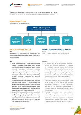TEKNOLOGI INFORMASI KOMUNIKASI DAN DATa MANAJEMEN (ICT & DM) Information Communication Technology and Data Management (ICT & DM)VISION & MISSION FUNCTION OF ICT & DMVisionTo be a world class ICT and DM Service Provider.Mission1. To position ICT & DM as strategic enablers - achieve key business objectives by focusing on important matters namely effectiveness, efficiency, information security, integrity, service availability, procedure compliance, and service reliability (achieving business goals by focusing on effectiveness, efficiency, confidentiality, integrity, availability, compliance and reliability matters). 2. Continually increasing the contribution and value added benefits of ICT & DM for PHE and PHE Subsidiaries (improve ICT & DM contribution and value to PHE business and subsidiaries) in increasing profits, as befits the services of a worldclass company. 3. Providing information and communication technology, application development and maintenance and data management (to provide information technology, application development and maintenance and data management), as an ICT & DM service area for PHE and PHE Subsidiaries.VP ICT & Data ManagementVice President of ICT & Data ManagementICT Governance& ComplianceManagerBusiness &Upstream DataManagement ManagerICT Solution ManagerICT OperationManagerBusinessDemandManagerOrganisasi Fungsi ICT & DMOrganization of ICT & DM FunctionVISI DAN MISI FUNGSI ICT & DMVisi Menjadi penyedia layanan teknologi informasi dan data management yang berkelas dunia (World Class ICT & DM Service Provider).Misi 1. Untuk memposisikan ICT & DM sebagai strategic enabler %u2013 mencapai tujuan bisnis utama dengan memfokuskan pada hal-hal penting yaitu efektifitas, efisiensi, keamanan informasi, integritas, ketersediaan layanan, kepatuhan prosedur, dan kehandalan layanan (achieve business goal by focusing on effectiveness, efficiency, confidentiality, integrity, availability, compliance and reliability matters).2. Secara berkesinambungan meningkatkan kontribusi dan nilai tambah manfaat ICT & DM bagi PHE dan Anak Perusahaan PHE (improve ICT & DM contribution and value to PHE business and subsidiaries) dalam meningkatkan laba, sebagaimana layaknya layanan sebuah perusahaan yang berkelas dunia.3. Menyediakan teknologi informasi dan komunikasi, pengembangan dan pemeliharaan aplikasi dan data management (to provide information technology, application development and maintenance and data management), sebagai area layanan ICT & DM untuk PHE dan Anak Perusahaan PHE.Tata Kelola Perusahaan yang BaikGood Corporate GovernanceTanggung Jawab Sosial PerusahaanCorporate Social ResponsibilityLaporan Keuangan KonsolidasianConsolidated Financial ReportPT Pertamina Hulu Energi2020 Laporan Tahunan TerintegrasiIntegrated Annual Report 519