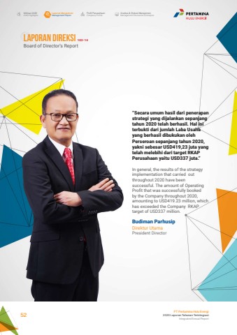 Budiman ParhusipDirektur UtamaPresident DirectorLaporan ManajemenManagement ReportProfil PerusahaanCompany ProfileAnalisa & Diskusi ManajemenManagement Discussion & AnalysisIkhtisar 20202020 HighlightsPT Pertamina Hulu Energi2020 Laporan Tahunan TerintegrasiIntegrated Annual Report 52LAPORAN DIREKSI 102-14Board of Director%u2019s Report %u201cSecara umum hasil dari penerapan strategi yang dijalankan sepanjang tahun 2020 telah berhasil. Hal ini terbukti dari jumlah Laba Usaha yang berhasil dibukukan oleh Perseroan sepanjang tahun 2020, yakni sebesar USD419,23 juta yang telah melebihi dari target RKAP Perusahaan yaitu USD337 juta.%u201dIn general, the results of the strategy implementation that carried out throughout 2020 have been successful. The amount of Operating Profit that was successfully booked by the Company throughout 2020, amounting to USD419.23 million, which has exceeded the Company RKAP target of USD337 million.