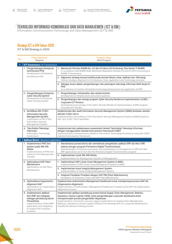 No Pokok BahasanSubjectsProgram KerjaWork Program1 ICT Governance | ICT Governance1. Pengembangan Enterprise Architecture PHEDevelopment of Enterprise Architecture PHE 1. Memenuhi Permen BUMN No. 02 dan 03 tahun 2018 tentang Tata Kelola TI BUMN.In compliance with BUMN State Ministerial Regulation Number 02 and 03 2018 concerning to BUMN IT Governance.2. Alignment strategi secara holistik pada domain Bisnis, Data, Aplikasi dan Teknologi.Holistic strategic alignment in the Business, Data, Application and Technology domains.3. Sebagai acuan dalam pengembangan dan penerapan teknologi informasi lebih lanjut di PHE.As a reference in further information technology development and application at PHE.2. Pengembangan Enterprise Cyber Security SystemDevelopment of Enterprise Cyber Security System 1. Pengembangan infrastruktur dan sistem kontrol.Development of infrastructure and control systems.2. Pengembangan dan sinergi program Cyber Security Resilience Implementation (CSRI) %u2013 Corporate ICT Persero.Development and synergy of the Cyber Security Resilience Implementation (CSRI) program - %u200b%u200bCorporate ICT Persero.3. Sertifikasi ISO 27001 Information Security Management SystemCertification of ISO 27001 Information Security Management SystemImplementasi dan audit Information Security Management System (ISMS) berbasis standar ISO/IEC 27001:2013.Implementation and auditing of the Information Security Management System (ISMS) based on ISO / IEC 27001: 2013 standards.4. Tata Kelola Teknologi Informasi Information Technology GovernanceImplementasi dan pelaksanaan assessment terkait Tata Kelola Teknologi Informasi dengan menggunakan standar best practice framework COBIT.Implementation of assessments related to Information Technology Governance using the COBIT standard best practice framework.2 Aplikasi Bisnis | Business Application1. Implementasi PHE One System pada WK Alih KelolaImplementation of PHE One System in the Working Area Transfer1. Standarisasi proses bisnis dan sentralisasi pengelolaan aplikasi ERP dan Non ERP, selaras dengan program Pertamina Digital Transformation.Standardization of business processes and centralization of management of ERP and Non ERP applications are in line with the Pertamina Digital Transformation program.2. Implementasi untuk WK Alih Kelola.Implementation for Working Area Transfer of Management.2. Optimalisasi SAP Plant MaintenanceOptimization of SAP Plant Maintenance1. Implementasi SAP Linear Asset Management System (LAMS).Implementation of SAP Linear Asset Management System (LAMS).2. Implementasi Asset Integrity Management System.Implementation of Asset Integrity Management System.3. Integrasi Peralatan Produksi dengan SAP PM (Plant Maintenance).Intregation of Production Tools with SAP Plant Maintenance.3. Optimalisasi Organisation Alignment SAPOptimization of Organisation Alignment SAP.Implementasi Authorization Management Dashboard untuk mempercepat proses SAP OA (Organisation Alignment).Implementation of Authorization Management Dashboard to speed up the SAP OA (Organization Alignment) process.4. Implementasi aplikasi Non-ERP dan integrasi sebagai pendukung bisnis PerusahaanImplementation of Non-ERP application and integration to support the Company businessImplementasi aplikasi pendukung proses bisnis Supply Chain Management, Relation, Operation, Human Capital, HSSE, serta pengembangan corporate dashboard untuk mempermudah proses pengambilan keputusan.Implementation of business process support applications for Supply Chain Management, Relations, Operations, Human Capital, HSSE,and the development of a corporate dashboard to simplify the decision-making process.TEKNOLOGI INFORMASI KOMUNIKASI DAN DATa MANAJEMEN (ICT & DM) Information Communication Technology and Data Management (ICT & DM)Strategi ICT & DM Tahun 2020ICT & DM Strategy in 2020Laporan ManajemenManagement ReportProfil PerusahaanCompany ProfileAnalisa & Diskusi ManajemenManagement Discussion & AnalysisIkhtisar 20202020 HighlightsPT Pertamina Hulu Energi2020 Laporan Tahunan TerintegrasiIntegrated Annual Report 520