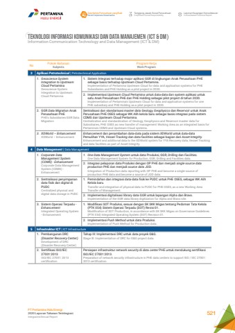 No Pokok BahasanSubjectsProgram KerjaWork Program3 Aplikasi Petrotechnical | Petrotechnical Application1. Geoscience System Integration to UpstreamCloud PertaminaGeoscience System Integration to Upstream Cloud Pertamina1. Sistem Integrasi terhadap major aplikasi GGR di lingkungan Anak Perusahaan PHE sebagai basis terhadap Upstream Cloud Pertamina.Implementation of Pertamina Upstream Cloud for data and application systems for PHE Subsidiaries and PHE Holding as a pilot project in 2020.2. Implementasi Upstream Cloud Pertamina untuk data-data dan system aplikasi untuk satu Anak Perusahaan PHE dan PHE Holding sebagai pilot project di tahun 2020.Implementation of Pertamina's Upstream Cloud for data and application systems for one PHE subsidiary and PHE Holding as a pilot project in 2020.2. GGR Data Migration Anak Perusahaan PHEPHE's Subsidiaries GGR Data MigrationSentralisasi dan standarisasi master data Geology, Geophysics dan Reservoir untuk Anak Perusahaan PHE OSES sebagai WK Alih kelola baru sebagai basis integrasi pada sistem CDMS dan Upstream Cloud Pertamina.Centralization and standardization of Geology, Geophysics and Reservoir master data for Subsidiaries, PHE OSES as new transfer of management Working Area as an integrated basis for Pertamina's CDMS and Upstream Cloud systems.3. XDWorld %u2013 EnhancementXDWorld %u2013 EnhancementEnhancement dan penambahan data-data pada sistem XDWorld untuk data-data Pemulihan YYA, Vessel Tracking dan data facilities sebagai bagian dari Asset Integrity.Enhancement and additional data to the XDWorld system for YYA Recovery data, Vessel Tracking and data facilities as part of Asset Integrity.4 Data Management | Data Management1. Corporate Data Management System (CDMS) - EnhancementCorporate Data Management System (CDMS) - Enhancement1. One Data Management System untuk data Produksi, GGR, Drilling dan Facilities.One Data Management System for Production, GGR, Drilling and Facilities data.2. Integrasi pelaporan data Produksi dengan OP PHE dan menjadi single source dataproduction PHE dan menjadi source data JOD.Integration of Production data reporting with OP PHE and become a single source of production PHE data and become a source of JOD data.2. Sentralisasi penyimpanan data fisik dan digital di PUDCCentralized physical and digital data storage in PUDC1. Pemindahan dan integrasi data-data fisik ke PUDC untuk PHE OSES, sebagai WK Alih Kelola baru.Transfer and integration of physical data to PUDC for PHE OSES, as a new Working Area Transfer of Management.2. Implementasi digitalisasi library data GGR untuk lapangan Alpha dan Bravo.Implementation of the GGR data library digitization for Alpha and Bravo site.3. Sistem Operasi Terpadu - EnhancementIntegrated Operating System - Enhancement1. Modifikasi SOT Produksi, sesuai dengan SK SKK Migas tentang Pedoman Tata Kelola (PTK 054) Sistem Operasi Terpadu (SOT) Revisi 01.Modification of SOT Production, in accordance with SK SKK Migas on Governance Guidelines (PTK 054) Integrated Operating System (SOT) Revision 01.2. Implementasi Push Method untuk data Produksi.Implementation of Push Method for Production data.5 Infrastruktur ICT | ICT Infrastructure1. Pembangunan DRC (Disaster Recovery Center) Development of DRC (Disaster Recovery Center) Tahap III: Implementasi DRC untuk data proyek G&G.Stage III: Implementation of DRC for G&G project data.2. Sertifikasi ISO/IEC 27001:2013ISO/IEC 27001: 2013 certificationPersiapan infrastruktur network security di data center PHE untuk mendukung sertifikasi ISO/IEC 27001:2013.Preparation of network security infrastructure in PHE data centers to support ISO / IEC 27001: 2013 certification.TEKNOLOGI INFORMASI KOMUNIKASI DAN DATa MANAJEMEN (ICT & DM) Information Communication Technology and Data Management (ICT & DM)Tata Kelola Perusahaan yang BaikGood Corporate GovernanceTanggung Jawab Sosial PerusahaanCorporate Social ResponsibilityLaporan Keuangan KonsolidasianConsolidated Financial ReportPT Pertamina Hulu Energi2020 Laporan Tahunan TerintegrasiIntegrated Annual Report 521