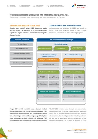 ACHIEVEMENTS AND INITIATIVES 2020Achievements and initiatives in 2020 are based on the ICT & DM 2020 work plan guided by the ICT Digital Enterprise Architecture as in the following diagram:The ICT & DM function has a strategic role related to the application of the PHE One System and the readiness of the PHE to face the industrial revolution 4.0. Just like other sectors, the oil and gas sector including upstream oil and gas is also faced with the challenges of the industrial revolution 4.0, so PHE is required to carry CAPAIAN DAN INISIATIF TAHUN 2020Capaian dan inisiatif tahun 2020 didasarkan pada rencana kerja ICT & DM tahun 2020 yang berpedoman kepada ICT Digital Enterprise Architecture seperti pada diagram berikut:References Architecture PHE Enterprise Architecture LandscapePHE DEA CharterStrategic Level ArchitectureProject Level ArchitectureStrategic Level ArchitectureProject Level ArchitectureMotivation & StrategyAs is Architecture Landscape(based on BISPRO 2018To be Architecture LandscapePHE DEA MetamodelEnterprise Services ContractEnterprise Architecture ToolboxOther Framework & ReferencesAs is Landscape MapBrowse by Solution >>Portfolio Level ArchitectureBusiness (As is Architecture)Application (As is Architecture)Data(As is Architecture)Technology(As is Architecture)Portfolio Level ArchitectureBusiness (To be Architecture)Application (To be Architecture)Data(To be Architecture)Technology(To be Architecture)To be Landscape MapBrowse by Solution >>Stakeholders' Motivation PHE Capabilities Strategy, Roadmap &Implementation PlansFungsi ICT & DM memiliki peran strategis terkait dengan penerapan PHE One System dan kesiapan PHE menghadapi revolusi industri 4.0. Sama seperti sektor lain, sektor migas termasuk hulu migas juga dihadapkan pada tantangan revolusi industri 4.0, sehingga PHE dituntut melakukan transformasi dalam berbagai bidang TEKNOLOGI INFORMASI KOMUNIKASI DAN DATa MANAJEMEN (ICT & DM) Information Communication Technology and Data Management (ICT & DM)Laporan ManajemenManagement ReportProfil PerusahaanCompany ProfileAnalisa & Diskusi ManajemenManagement Discussion & AnalysisIkhtisar 20202020 HighlightsPT Pertamina Hulu Energi2020 Laporan Tahunan TerintegrasiIntegrated Annual Report 522