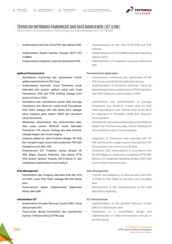 %u2022 Implementation of new One Portal PHE and PHE website.%u2022 Implementation of IOC E-MBER Integrated Operating System (SOT).%u2022 Implementation of integrated corporate dashboard PHE.Petrotechnical Application%u2022 Centralization, monitoring and optimization of the PHE Group petrotechnical application license.%u2022 Implementation of Pertamina Upstream Cloud for data and application systems for one PHE Subsidiary and PHE Holding as a pilot project in 2020.%u2022 Centralization and standardization of Geology, Geophysics and Reservoir master data for PHE OSES Subsidiary as new Transfer Area as the basis for integration in Pertamina CDMS and Upstream Cloud systems.%u2022 Development and enhancement data on the XDWorld system for YYA Recovery data, Vessel Tracking and data facilities as part of Asset Integrity.%u2022 Integration of Production data reporting with OP PHE and become a single source of production PHE data and become a source of JOD data.%u2022 Production SOT enhancement, in accordance with SK SKK Migas on Governance Guidelines (PTK 054) Revision 01 Integrated Operating System (SOT) and Push method implementation.Data Management%u2022 Transfer and integration of physical data from SCU to PUDC for PHE OSES, as new take over of working area.%u2022 Enhancement in the implementation of the GGR data library digitizing.ICT Infrastructure%u2022 Implementation of the Disaster Recovery Center (DRC) for G&G project data.%u2022 Preparation of a consolidated design and standardization of Telecommunication services in the PHE group.%u2022 Implementasi new One Portal PHE dan website PHE.%u2022 Implementasi Sistem Operasi Terpadu (SOT) IOC E-MBER.%u2022 Implementasi integrated corporate dashboard PHE.Aplikasi Petrotechnical%u2022 Sentralisasi, monitoring dan optimalisasi lisensi aplikasi petrotechnical PHE Grup.%u2022 Implementasi Upstream Cloud Pertamina untuk data-data dan system aplikasi untuk satu Anak Perusahaan PHE dan PHE Holding sebagai pilot project di tahun 2020.%u2022 Sentralisasi dan standarisasi master data Geology,Geophysics dan Reservoir untuk Anak Perusahaan PHE OSES sebagai WK Alih kelola baru sebagai basis integrasi pada sistem CDMS dan Upstream Cloud Pertamina.%u2022 Melakukan penambahan dan enhancement datadata pada sistem XDWorld untuk data-data Pemulihan YYA, Vessel Tracking dan data facilities sebagai bagian dari Asset Integrity.%u2022 Integrasi pelaporan data Produksi dengan OP PHE dan menjadi single source data production PHE dan menjadi source data JOD.%u2022 Enhancement SOT Produksi, sesuai dengan SK SKK Migas tentang Pedoman Tata Kelola (PTK 054) Sistem Operasi Terpadu (SOT) Revisi 01 dan melakukan implementasi Push method.Data Management%u2022 Pemindahan dan integrasi data-data fisik dari SCU ke PUDC untuk PHE OSES, sebagai WK Alih Kelola baru.%u2022 Enhancement dalam Implementasi digitalisasi library data GGR. Infrastruktur ICT%u2022 Implementasi Disaster Recovery Center (DRC) untuk data proyek G&G.%u2022 Penyusunan design konsolidasi dan standarisasi layanan Telekomunikasi di PHE grup.TEKNOLOGI INFORMASI KOMUNIKASI DAN DATa MANAJEMEN (ICT & DM) Information Communication Technology and Data Management (ICT & DM)Laporan ManajemenManagement ReportProfil PerusahaanCompany ProfileAnalisa & Diskusi ManajemenManagement Discussion & AnalysisIkhtisar 20202020 HighlightsPT Pertamina Hulu Energi2020 Laporan Tahunan TerintegrasiIntegrated Annual Report 524