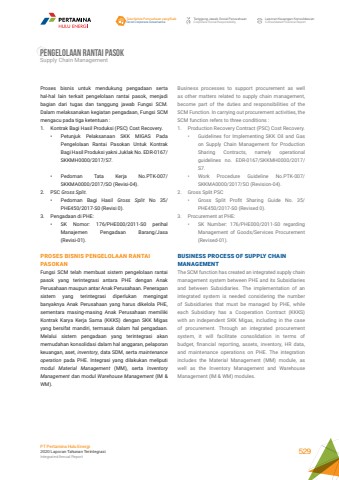 PENGELOLAAN RANTAI PASOKSupply Chain ManagementBusiness processes to support procurement as well as other matters related to supply chain management, become part of the duties and responsibilities of the SCM Function. In carrying out procurement activities, the SCM function refers to three conditions :1. Production Recovery Contract (PSC) Cost Recovery.%u2022 Guidelines for Implementing SKK Oil and Gas on Supply Chain Management for Production Sharing Contracts, namely operational guidelines no. EDR-0167/SKKMH0000/2017/ S7. %u2022 Work Procedure Guideline No.PTK-007/SKKMA0000/2017/SO (Revision-04). 2. Gross Split PSC %u2022 Gross Split Profit Sharing Guide No. 35/ PHE450/2017-S0 (Revised 0).3. Procurement at PHE: %u2022 SK Number: 176/PHE000/2011-S0 regarding Management of Goods/Services Procurement (Revised-01).BUSINESS PROCESS OF SUPPLY CHAIN MANAGEMENTThe SCM function has created an integrated supply chain management system between PHE and its Subsidiaries and between Subsidiaries. The implementation of an integrated system is needed considering the number of Subsidiaries that must be managed by PHE, while each Subsidiary has a Cooperation Contract (KKKS) with an independent SKK Migas, including in the case of procurement. Through an integrated procurement system, it will facilitate consolidation in terms of budget, financial reporting, assets, inventory, HR data, and maintenance operations on PHE. The integration includes the Material Management (MM) module, as well as the Inventory Management and Warehouse Management (IM & WM) modules.Proses bisnis untuk mendukung pengadaan serta hal-hal lain terkait pengelolaan rantai pasok, menjadi bagian dari tugas dan tanggung jawab Fungsi SCM. Dalam melaksanakan kegiatan pengadaan, Fungsi SCM mengacu pada tiga ketentuan :1. Kontrak Bagi Hasil Produksi (PSC) Cost Recovery.%u2022 Petunjuk Pelaksanaan SKK MIGAS Pada Pengelolaan Rantai Pasokan Untuk Kontrak Bagi Hasil Produksi yakni Juklak No. EDR-0167/SKKMH0000/2017/S7.%u2022 Pedoman Tata Kerja No.PTK-007/ SKKMA0000/2017/SO (Revisi-04).2. PSC Gross Split.%u2022 Pedoman Bagi Hasil Gross Split No 35/PHE450/2017-S0 (Revisi 0).3. Pengadaan di PHE:%u2022 SK Nomor: 176/PHE000/2011-S0 perihal Manajemen Pengadaan Barang/Jasa (Revisi-01).PROSES BISNIS PENGELOLAAN RANTAI PASOKAN Fungsi SCM telah membuat sistem pengelolaan rantai pasok yang terintegrasi antara PHE dengan Anak Perusahaan maupun antar Anak Perusahaan. Penerapan sistem yang terintegrasi diperlukan mengingat banyaknya Anak Perusahaan yang harus dikelola PHE, sementara masing-masing Anak Perusahaan memiliki Kontrak Karya Kerja Sama (KKKS) dengan SKK Migas yang bersifat mandiri, termasuk dalam hal pengadaan. Melalui sistem pengadaan yang terintegrasi akan memudahan konsolidasi dalam hal anggaran, pelaporan keuangan, aset, inventory, data SDM, serta maintenance operation pada PHE. Integrasi yang dilakukan meliputi modul Material Management (MM), serta Inventory Management dan modul Warehouse Management (IM & WM).Tata Kelola Perusahaan yang BaikGood Corporate GovernanceTanggung Jawab Sosial PerusahaanCorporate Social ResponsibilityLaporan Keuangan KonsolidasianConsolidated Financial ReportPT Pertamina Hulu Energi2020 Laporan Tahunan TerintegrasiIntegrated Annual Report 529