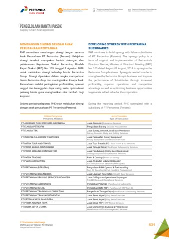 PENGELOLAAN RANTAI PASOKSupply Chain ManagementDEVELOPING SYNERGY WITH PERTAMINA SUBSIDIARIESPHE continues to build synergy with fellow subsidiaries of PT Pertamina (Persero). The synergy policy is a form of support and implementation of Pertamina%u2019s Directors %u2018Decree, Minutes of Directors%u2019 Meeting (RRD) No. 103 dated August 02 August, 2018 to synergize the Pertamina Group business. Synergy is needed in order to strengthen the Pertamina Group%u2019s business and improve the performance of Subsidiaries through increased profitability, superior operations and competitive advantage as well as optimizing business opportunities to generate added value for the corporation.During the reporting period, PHE synergized with a subsidiary of PT Pertamina (Persero):MEMBANGUN SINERGI DENGAN ANAK PERUSAHAAN PERTAMINAPHE senantiasa membangun sinergi dengan sesama Anak Perusahaan PT Pertamina (Persero). Kebijakan sinergi tersebut merupakan bentuk dukungan dan pelaksanaan Keputusan Direksi Pertamina, Risalah Rapat Direksi (RRD) No. 103 tanggal 2 Agustus 2018 untuk melakukan sinergi terhadap bisnis Pertamina Group. Sinergi diperlukan dalam rangka memperkuat bisnis Pertamina Grup dan meningkatkan kinerja Anak Perusahaan melalui peningkatan profitabilitas, operasi unggul dan keunggulan daya saing serta optimalisasi peluang bisnis guna menghasilkan nilai tambah bagi korporat.Selama periode pelaporan, PHE telah melakukan sinergi dengan anak perusahaan PT Pertamina (Persero):Afiliasi PertaminaPertamina AffiliationJenis TransaksiType of TransactionPT ASURANSI TUGU PRATAMA INDONESIA Jasa Asuransi | Insurance ServicesPT ELNUSA PETROFIN Pengadaan Barang | Goods ProcurementPT ELNUSA TBK. Jasa Survey, Seismik, Studi dan PemboranSurvey, Seismic, Study and Drilling ServicesPT INDOPELITA AIRCRAFT SERVICES Jasa Perawatan Rotary EquipmentRotary Equipment Maintenance ServicesPT MITRA TOUR AND TRAVEL Jasa Tour Travel & EO | Tour Travel & EO ServicesPT PATRA BADAK ARUN SOLUSI Jasa Tenaga Kerja | Workforce Outsourcing ServicesPT PATRA DRILLING CONTRACTOR Jasa Pendukung Drilling dan OperasionalDrilling Support and Operational ServicesPT PATRA TRADING Paint & Coating | Paint & CoatingPT PELITA AIR SERVICE Jasa Angkutan Udara (Helikopter)Air Transportation Services (Helicopter)PT PERTAMINA (PERSERO) Pengadaan BBM Operasi & Fuel HandlingFuel Oil Operation & Fuel Handling ProcurementPT PERTAMINA BINA MEDIKA Jasa Layanan Kesehatan | Health Care ServicesPT PERTAMINA DRILLING SERVICES INDONESIA Jasa Drilling dan Operasional LapanganField Drilling and Operational ServicesPT PERTAMINA LUBRICANTS Pembelian Pelumas | Purchase of LubricantsPT PERTAMINA RETAIL Pembelian BBM KRP | Purchase of KRP Fuel OilPT PERTAMINA TRAINING & CONSULTING Penyediaan Tenaga Kerja | Workforce Outsourcing ServicesPT PERTAMINA TRANS KONTINENTAL Jasa Sewa Kapal | Ship Rental ServicesPT PETEKA KARYA SAMUDERA Jasa Sewa Kapal | Ship Rental ServicesPT PRIMA ARMADA RAYA Jasa Sewa KRP | KRP Rental ServicesPT SIGMA CIPTA UTAMA Jasa Manajemen Gudang & PerkantoranWarehouse & Office Management ServicesTata Kelola Perusahaan yang BaikGood Corporate GovernanceTanggung Jawab Sosial PerusahaanCorporate Social ResponsibilityLaporan Keuangan KonsolidasianConsolidated Financial ReportPT Pertamina Hulu Energi2020 Laporan Tahunan TerintegrasiIntegrated Annual Report 531