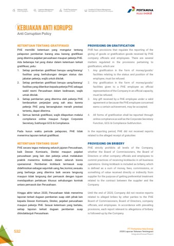 KEBIJAKAN ANTI KORUPSIAnti Corruption PolicyPROVISIONS ON GRATIFICATION PHR has provisions that regulate the reporting of the giving of goods or gratification goods received by PHE company officials and employees. There are several matters regulated in the provisions pertaining to gratification, which are: 1. Any gratification in the form of money/goods/ facilities relating to the status and position of the employee, must be refused. 2. Any gratification in the form of money/goods/ facilities given to a PHE employee as official representative of the Company in an official capacity, must be refused; 3. Any gift received by a PHE employee under a valid agreement or because the PHE employee concerned earns a certain achievement, may be accepted; 4. All forms of gratification shall be reported through online compliance as well as the Corporate Secretary Function, GCG & Compliance Subfunction. In the reporting period, PHE did not received reports related to the alleged receipt of gratuitiesPROVISIONS ON BRIBERYPHE strictly prohibits all levels of the Company, whether the Board of Commissioners, the Board of Directors or other company officials and employees to commit practices of receiving kickbacks in all business operations. Giving kickback is included as bribery, which is defined as a sum of money, fees, commissions, or something of value received directly or indirectly from supplier for the purpose of getting preferential treatment related to the contract between the supplier and the Company. Until the end of 2020, Company did not receive reports related to alleged bribes by other parties to the PHE Board of Commissioners, Board of Directors, company officials, and employees. In accordance with prevailing provisions, each report relevant to allegations of bribery is followed-up by the Company.KETENTUAN TENTANG GRATIFIKASIPHE memiliki ketentuan yang mengatur tentang pelaporan pemberian barang atau barang gratifikasi yang diterima pejabat perusahaan maupun pekerja PHE. Ada beberapa hal yang diatur dalam ketentuan terkait gratifikasi, yaitu:1. Setiap pemberian gratifikasi berupa uang/barang/fasilitas yang berhubungan dengan status dan jabatan pekerja, wajib untuk ditolak.2. Setiap pemberian gratifikasi berupa uang/barang/fasilitas yang diberikan kepada pekerja PHE sebagai wakil resmi Perusahaan dalam kedinasan, wajib untuk ditolak.3. Setiap pemberian yang diterima oleh pekerja PHE berdasarkan perjanjian yang sah atau karena pekerja PHE yang bersangkutan meraih prestasi tertentu, dapat diterima.4. Semua bentuk gratifikasi, wajib dilaporkan melalui compliance online maupun Fungsi Corporate Secretary, Subfungsi GCG & Compliance.Pada kurun waktu periode pelaporan, PHE tidak menerima laporan terkait gratifikasi. KETENTUAN TENTANG SUAPPHE secara tegas melarang seluruh jajaran Perusahaan, baik Dewan Komisaris, Direksi maupun pejabat perusahaan yang lain dan pekerja untuk melakukan praktik menerima kickback dalam seluruh bisnis operasional. Pemberian kickback termasuk suap didefinisikan sebagai sejumlah uang, fee, komisi, sesuatu yang berharga yang diterima baik secara langsung maupun tidak langsung dari pemasok dengan tujuan mendapatkan perlakuan khusus sehubungan kontrak antara pemasok dan Perusahaan.Hingga akhir tahun 2020, Perusahaan tidak menerima laporan terkait dugaan pemberian suap oleh pihak lain kepada Dewan Komisaris, Direksi, pejabat perusahaan maupun pekerja PHE. Sesuai ketentuan yang berlaku, setiap laporan terkait dugaan pemberian suap ditindaklanjuti Perusahaan.Laporan ManajemenManagement ReportProfil PerusahaanCompany ProfileAnalisa & Diskusi ManajemenManagement Discussion & AnalysisIkhtisar 20202020 HighlightsPT Pertamina Hulu Energi2020 Laporan Tahunan TerintegrasiIntegrated Annual Report 532