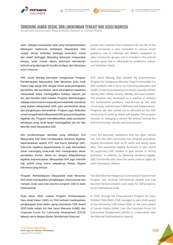 people who maintain their traditional life, the life of the SAD community is very vulnerable to various social problems and is relatively left behind compared to other community groups, and is included in the cultural poverty group that is influenced by conditions, culture, and hereditary habits.PHE Jambi Merang then initiated the Empowerment Program for Indigenous Minority Tribal Communities for SAD residents with a focus on improving education and health, as well as increasing community capacity without leaving their culture, history, identity, and local wisdom.The program was developed as a solution to address the fundamental problems experienced by the SAD Community, namely basic fulfillment and independence. Programs are also carried out to advocate for the SAD Community in order to obtain self-legality. The program focuses on changing a decent life without leaving the SAD Community%u2019s identity and local wisdom.From the advocacy assistance that has been carried out, now the SAD community has obtained population legality documents such as ID cards and family cards (KK). This population legality document is also useful for supporting SAD children to gain access to formal education. In addition, by obtaining residency legality, SAD Community also have the same political rights as other Indonesian citizens.The SAD Minority Indigenous Community Empowerment Program has received international awards and has become the best practice case study for CSR programs on an international scale.In 2020, through the Empowerment Program for Inner Children Tribe (SAD), PHE managed to get a Gold award at the Indonesian CSR Award 2020 on the core subject of Human Rights (HAM), from the Corporate Forum for Community Development (CFCD) in collaboration with the National Standardization Agency.alam. Sebagai masyarakat adat yang mempertahankan kehidupan tradisional, kehidupan Masyarakat SAD sangat rentan terhadap berbagai persoalan sosial dan relatif tertinggal dibanding kelompok masyarakat lainnya, serta masuk dalam kelompok kemiskinan kultural yang dipengaruhi kondisi, budaya, dan kebiasaan turun menurun. PHE Jambi Merang kemudian menginisiasi Program Pemberdayaan Masyarakat Adat Minoritas Suku Anak Dalam bagi warga SAD dengan fokus pada peningkatan pendidikan dan kesehatan, serta peningkatan kapasitas masyarakat tanpa meninggalkan budaya, sejarah, jati diri, dan kearifan lokal mereka. Program dikembangkan sebagai solusi untuk menjawab permasalahan mendasar yang dialami Masyarakat SAD, yaitu pemenuhan dasar dan penghidupan kemandirian. Program juga dilakukan untuk mengadvokasi Masyarakat SAD guna mendapatkan legalitas diri. Program menitikberatkan pada perubahan kehidupan yang layak tanpa meninggalkan jati diri dan kearifan lokal Masyarakat SAD.Dari pendampingan advokasi yang dilakukan, kini Masyarakat SAD telah mendapatkan dokumen legalitas kependudukan seperti KTP dan Kartu Keluarga (KK). Dokumen legalitas kependudukan ini juga bermanfaat untuk menunjang anak-anak SAD mendapatkan akses pendidikan formal. Selain itu, dengan didapatkannya legalitas kependudukan, Masyarakat SAD juga memiliki hak politik yang sama selayaknya Warga Negara Indonesia yang lainnya. Program Pemberdayaan Masyarakat Adat Minoritas SAD telah mendapatkan penghargaan internasional dan menjadi study case best practice program CSR di skala internasional.Pada tahun 2020, melalui Program Pemberdayaan Suku Anak Dalam (SAD) ini, PHE berhasil mendapatkan penghargaan Gold dalam ajang Indonesian CSR Award 2020 pada subjek inti Hak Asasi Manusia (HAM), dari Corporate Forum for Community Development (CFCD) bekerja sama dengan Badan Standarisasi Nasional.TANGGUNG JAWAB SOSIAL DAN LINGKUNGAN TERKAIT HAK ASASI MANUSIASocial and Environment Responsibility Related to Human RightsTata Kelola Perusahaan yang BaikGood Corporate GovernanceTanggung Jawab Sosial PerusahaanCorporate Social ResponsibilityLaporan Keuangan KonsolidasianConsolidated Financial ReportPT Pertamina Hulu Energi2020 Laporan Tahunan TerintegrasiIntegrated Annual Report 539