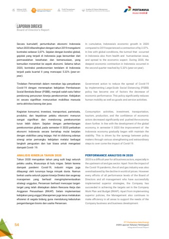 Laporan ManajemenManagement ReportProfil PerusahaanCompany ProfileAnalisa & Diskusi ManajemenManagement Discussion & AnalysisIkhtisar 20202020 HighlightsPT Pertamina Hulu Energi2020 Laporan Tahunan TerintegrasiIntegrated Annual Report 54Secara kumulatif, pertumbuhan ekonomi Indonesia tahun 2020 dibandingkan dengan tahun 2019 mengalami kontraksi sebesar 2,07%. Sejalan dengan kondisi global, gejolak yang terjadi di Indonesia juga bersumber dari permasalahan kesehatan dan kemanusiaan, yang kemudian merambat ke aspek ekonomi. Selama tahun 2020, kontraksi perekonomian terdalam di Indonesia terjadi pada kuartal II yang mencapai 5.32% (year-onyear).Tindakan Pemerintah dalam menekan laju penyebaran Covid-19 dengan menerapkan kebijakan Pembatasan Sosial Berskala Besar (PSBB), menjadi salah satu faktor pendorong penurunan kinerja perekonomian. Kebijakan ini secara signifikan menurunkan mobilitas manusia serta aktivitas barang dan jasa.Kegiatan konsumsi, investasi, transportasi, pariwisata, produksi, dan keyakinan pelaku ekonomi menurun sangat signifikan dan mendorong perekonomian turun lebih dalam. Sejalan dengan perkembangan perekonomian global, pada semester II 2020 perbaikan ekonomi Indonesia secara bertahap mulai berjalan dengan stabilitas yang terjaga. Hal ini didorong adanya sinergi antar pemangku kebijakan melalui berbagai langkah penguatan dan luar biasa untuk mengatasi dampak Covid- 19.ANALISIS KINERJA TAHUN 2020Tahun 2020 merupakan tahun yang sulit bagi seluruh pelaku usaha, khususnya di hulu migas. Selain karena dampak pandemi Covid-19, industri migas juga dibayangi oleh turunnya harga minyak dunia. Namun berkat usaha seluruh jajaran kinerja Direksi dan segenap manajemen yang berhasil mengimplementasikan strategi unggulan, Perseroan berhasil mencapai targettarget yang telah ditetapkan dalam Rencana Kerja dan Anggaran Perusahaan (RKAP). Selain implementasi kebijakan yang unggul, Manajemen juga terus melakukan efisiensi di segala bidang guna mendukung kebutuhan pengembangan bisnis dan usaha Perseroan.In cumulative, Indonesia%u2019s economic growth in 2020 compared to 2019 experienced a contraction of by 2.07%. In line with global conditions, the turmoil that occurred in Indonesia also from health and humanitarian issue, and spread to the economic aspect. During 2020, the deepest economic contraction in Indonesia occurred in the second quarter reached by 5.32% (year-on-year).Government action to reduce the spread of Covid-19 by implementing Large-Scale Social Distancing (PSBB) policy has become one of factors the decrease of economic performance. This policy significantly reduces human mobility as well as goods and service activities.Consumption activities, investment, transportation, tourism, production, and the confidence of economic actors decreased significantly and pushed the economy down further. In line with the development of the global economy, in semester II 2020 the improvement of the Indonesia economy gradually began with maintain the stability. This is driven by the synergy between policy makers through various strengthening and extraordinary steps to over come the impact of Covid-19.PERFORMANCE ANALYSIS IN 20202020 is a difficult year for all business actors, especially in the upstream oil and gas sector. Apart from the impact of the Covid-19 pandemic, the oil and gas industry was also overshadowed by the decline in world oil prices. However every efforts of all performance levels of the Board of Directors and all management who have successfully implemented superior strategies, the Company has succeeded in achieving the targets set in the Company Work Plan and Budget (RKAP). Apart from implementing superior policies, the Management also continues to make efficiency in all areas to support the needs of the Company business and business development.Laporan direksiBoard of Director%u2019s Report