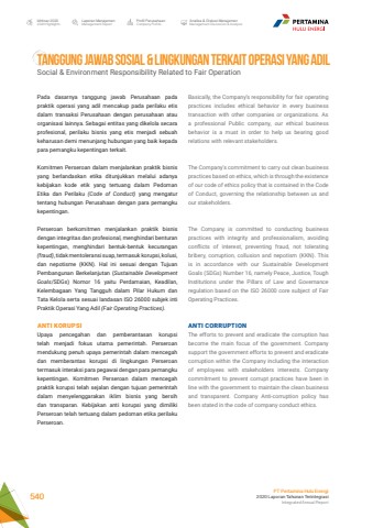 TANGGUNG JAWAB SOSIAL & LINGKUNGAN TERKAIT OPERASI YANG ADILSocial & Environment Responsibility Related to Fair OperationBasically, the Company%u2019s responsibility for fair operating practices includes ethical behavior in every business transaction with other companies or organizations. As a professional Public company, our ethical business behavior is a must in order to help us bearing good relations with relevant stakeholders. The Company%u2019s commitment to carry out clean business practices based on ethics, which is through the existence of our code of ethics policy that is contained in the Code of Conduct, governing the relationship between us and our stakeholders. The Company is committed to conducting business practices with integrity and professionalism, avoiding conflicts of interest, preventing fraud, not tolerating bribery, corruption, collusion and nepotism (KKN). This is in accordance with our Sustainable Development Goals (SDGs) Number 16, namely Peace, Justice, Tough Institutions under the Pillars of Law and Governance regulation based on the ISO 26000 core subject of Fair Operating Practices.ANTI CORRUPTIONThe efforts to prevent and eradicate the corruption has become the main focus of the government. Company support the government efforts to prevent and eradicate corruption within the Company including the interaction of employees with stakeholders interests. Company commitment to prevent corrupt practices have been in line with the government to maintain the clean business and transparent. Company Anti-corruption policy has been stated in the code of company conduct ethics.Pada dasarnya tanggung jawab Perusahaan pada praktik operasi yang adil mencakup pada perilaku etis dalam transaksi Perusahaan dengan perusahaan atau organisasi lainnya. Sebagai entitas yang dikelola secara profesional, perilaku bisnis yang etis menjadi sebuah keharusan demi menunjang hubungan yang baik kepada para pemangku kepentingan terkait. Komitmen Perseroan dalam menjalankan praktik bisnis yang berlandaskan etika ditunjukkan melalui adanya kebijakan kode etik yang tertuang dalam Pedoman Etika dan Perilaku (Code of Conduct) yang mengatur tentang hubungan Perusahaan dengan para pemangku kepentingan. Perseroan berkomitmen menjalankan praktik bisnis dengan integritas dan profesional, menghindari benturan kepentingan, menghindari bentuk-bentuk kecurangan (fraud), tidak mentoleransi suap, termasuk korupsi, kolusi, dan nepotisme (KKN). Hal ini sesuai dengan Tujuan Pembangunan Berkelanjutan (Sustainable Development Goals/SDGs) Nomor 16 yaitu Perdamaian, Keadilan, Kelembagaan Yang Tangguh dalam Pilar Hukum dan Tata Kelola serta sesuai landasan ISO 26000 subjek inti Praktik Operasi Yang Adil (Fair Operating Practices).ANTI KORUPSI Upaya pencegahan dan pemberantasan korupsi telah menjadi fokus utama pemerintah. Perseroan mendukung penuh upaya pemerintah dalam mencegah dan memberantas korupsi di lingkungan Perseroan termasuk interaksi para pegawai dengan para pemangku kepentingan. Komitmen Perseroan dalam mencegah praktik korupsi telah sejalan dengan tujuan pemerintah dalam menyelenggarakan iklim bisnis yang bersih dan transparan. Kebijakan anti korupsi yang dimiliki Perseroan telah tertuang dalam pedoman etika perilaku Perseroan. Laporan ManajemenManagement ReportProfil PerusahaanCompany ProfileAnalisa & Diskusi ManajemenManagement Discussion & AnalysisIkhtisar 20202020 HighlightsPT Pertamina Hulu Energi2020 Laporan Tahunan TerintegrasiIntegrated Annual Report 540
