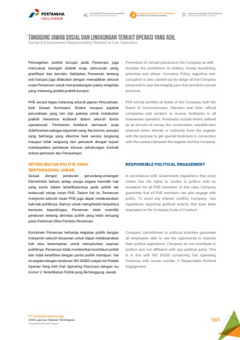 TANGGUNG JAWAB SOSIAL dan lingkungan TERKAIT OPERASI YANG ADILSocial & Environment Responsibility Related to Fair OperationPrevention of corrupt practices in the Company as wellincludes the prohibition on bribery, money laundering, gratuities and others. Company Policy regarding anticorruption is also carried out by oblige all the Company personnel to sign the integrity pact that prohibits corrupt practices.PHE strictly prohibit all levels of the Company, both the Board of Commissioners, Directors and other official companies and workers to receive kickbacks in all businesses operation. Kickbacks include bribes defined as an amount of money, fee, commission, valuable item received either directly or indirectly from the supplier with the purpose to get special treatment in connection with the contract between the supplier and the Company.RESPONSIBLE POLITICAL ENGAGEMENT In accordance with Government regulations that every citizen has the rights to involve in politics with no exception for all PHE members. In this case, Company guarantee that all PHE members can also engage with politic. To avoid any interest conflict, Company has regulations regarding political activity that have been stipulated on the Company Code of Conduct.Company commitment to political activities guarantee all employees able to use the opportunity to express their politics aspirations. Company do not contribute in politics and not affiliated with any political party. This is in line with ISO 26000 concerning Fair Operating Practices with issues number 2: Responsible Political Engagement.Pencegahan praktik korupsi pada Perseroan juga mencakup larangan praktik suap, pencucian uang, gratifikasi dan lain-lain. Kebijakan Perseroan tentang anti korupsi juga dilakukan dengan mewajibkan seluruh insan Perseroan untuk menandatangani pakta integritas yang melarang praktik-praktik korupsi. PHE secara tegas melarang seluruh jajaran Perusahaan, baik Dewan Komisaris, Direksi maupun pejabat perusahaan yang lain dan pekerja untuk melakukan praktik menerima kickback dalam seluruh bisnis operasional. Pemberian kickback termasuk suap didefinisikan sebagai sejumlah uang, fee, komisi, sesuatu yang berharga yang diterima baik secara langsung maupun tidak langsung dari pemasok dengan tujuan mendapatkan perlakuan khusus sehubungan kontrak antara pemasok dan Perusahaan.KETERLIBATAN POLITIK YANG BERTANGGUNG JAWAB Sesuai dengan peraturan perundang-undangan Pemerintah bahwa setiap warga negara memiliki hak yang sama dalam keterlibatannya pada politik tak terkecuali setiap insan PHE. Dalam hal ini, Perseroan menjamin seluruh insan PHE juga dapat melaksanakan hak-hak politiknya. Namun untuk menghindari terjadinya benturan kepentingan, Perseroan telah memiliki peraturan tentang aktivitas politik yang telah tertuang pada Pedoman Etika Perilaku Perseroan. Komitmen Perseroan terhadap kegiatan politik dengan menjamin seluruh karyawan untuk dapat melaksanakan hak atas kesempatan untuk menyalurkan aspirasi politiknya. Perseroan tidak memberikan kontribusi politik dan tidak berafiliasi dengan partai politik manapun. Hal ini sejalan dengan landasan ISO 26000 subjek inti Praktik Operasi Yang Adil (Fair Operating Practices) dengan isu nomor 2: Keterlibatan Politik yang Bertanggung Jawab.Tata Kelola Perusahaan yang BaikGood Corporate GovernanceTanggung Jawab Sosial PerusahaanCorporate Social ResponsibilityLaporan Keuangan KonsolidasianConsolidated Financial ReportPT Pertamina Hulu Energi2020 Laporan Tahunan TerintegrasiIntegrated Annual Report 541