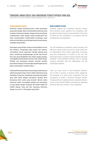 FAIR COMPETITIONCompany support fair competitive business climate with provisions which regulates the competition, with principle of mutual respect and pay attention to the rules of ethics and fair competition in accordance with the prevailing laws and regulations.Fair and widespread competition create innovation and efficiency, reduce product and service costs, make sure all organizations have similar opportunity, encourage long term development of product or the new and improved process, increase economic growth and living standards. Anti-competitive behavior risk to damage company reputation with the stakeholders and will create legal problems.There are many forms of anti-competitive behavior, one of them is pricing. In business ethics applied by the Company is to avoid unfair competition with the competitors to create a conducive business climate. Company efforts to implement anti-competitive behavior is also in line with ISO 26000 concerning Fair Operating Practices with issue number 3: Fair Competition.PERSAINGAN SEHAT Perseroan sangat mendukung iklim usaha persaingan yang sehat dengan tetap memperhatikan ketentuan yang mengatur tentang persaingan, dengan prinsip senantiasa melaksanakan usaha dengan saling menghormati dan tetap memperhatikan kaidah-kaidah persaingan yang sehat serta beretika sesuai dengan peraturan perundangundangan yang berlaku. Persaingan yang adil dan meluas menumbuhkan inovasi dan efisiensi, mengurangi biaya produk dan layanan, memastikan semua organisasi memiliki peluang yang sama, mendorong pengembangan produk atau proses baru atau yang ditingkatkan dan, dalam jangka panjang, meningkatkan pertumbuhan ekonomi dan standar hidup. Perilaku anti persaingan berisiko merusak reputasi perusahaan dengan para pemangku kepentingannya dan dapat menimbulkan masalah hukum. Ada banyak bentuk perilaku anti-persaingan salah satunya adalah penetapan harga. Namun dalam etika bisnis yang diterapkan Perseroan menghindari peraingan/kompetisi yang tidak sehat dengan perusahaan pesaing demi terciptanya iklim usaha yang kondusif. Bentuk usaha Perseroan dalam menerapkan perilaku anti persaingan ini juga sejalan dengan landasan ISO 26000 subjek inti Praktik Operasi Yang Adil (Fair Operating Practices)dengan isu nomor 3: Persaingan yang Sehat.TANGGUNG JAWAB SOSIAL dan lingkungan TERKAIT OPERASI YANG ADILSocial & Environment Responsibility Related to Fair OperationLaporan ManajemenManagement ReportProfil PerusahaanCompany ProfileAnalisa & Diskusi ManajemenManagement Discussion & AnalysisIkhtisar 20202020 HighlightsPT Pertamina Hulu Energi2020 Laporan Tahunan TerintegrasiIntegrated Annual Report 542
