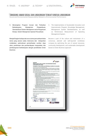 TANGGUNG JAWAB SOSIAL DAN LINGKUNGAN TERKAIT KINERJA LINGKUNGANSocial and Environmental Responsibility Related to Environmental Performance5. The implementation of Sustainable Innovation and Improvements Program, Knowledge Management, Management System Standardization, as well as Performance Measurement of Operating Management System.Become a part of the culture and mainstream of a conscious, planned and well-reported worldclass company by optimizing the use of natural resources, community development, and sustainable development based on Green Business approach5. Menerapkan Program Inovasi dan Perbaikan Berkelanjutan, Manajemen Pengetahuan, Standardisasi Sistem Manajemen serta Pengukuran Kinerja Sistem Manajemen Operasi Perusahaan.Menjadi bagian budaya dan arus utama perusahaan kelas dunia yang secara sadar, terencana dan terlaporkan melakukan optimalisasi pemanfaatan sumber daya alam, pembinaan dan pemberdayaan masyarakat, dan pembangunan berkelanjutan dengan pendekatan Green Business.Laporan ManajemenManagement ReportProfil PerusahaanCompany ProfileAnalisa & Diskusi ManajemenManagement Discussion & AnalysisIkhtisar 20202020 HighlightsPT Pertamina Hulu Energi2020 Laporan Tahunan TerintegrasiIntegrated Annual Report 544