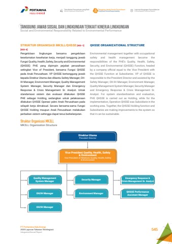 TANGGUNG JAWAB SOSIAL DAN LINGKUNGAN TERKAIT KINERJA LINGKUNGANSocial and Environmental Responsibility Related to Environmental PerformanceQHSSE ORGANIZATIONAL STRUCTUREEnvironmental management together with occupational safety and health management become the responsibilities of the PHE%u2019s Quality, Health, Safety, Security, and Environmental (QHSSE) Function, headed by a company official equal to the Vice President with the QHSSE Function at Subsidiaries. VP of QHSSE is responsible to the President Director and assisted by the Safety Manager, OH-IH Manager, Environment Manager, Quality Management System Manager, Security Manager and Emergency Response & Crisis Management Sr. Analyst. For system standardization and evaluation, PHE QHSSE is carried out as Holding, while for the implementation, Operation QHSSE was Subsidiarie in the working area. Together, the QHSSE Holding function and Subsidiaries are making improvements to the system so that it can be sustainable.STRUKTUR ORGANISASI MK3LL/QHSSE [403-1][403-4]Pengelolaan lingkungan bersama pengelolaan keselamatan kesehatan kerja, menjadi tanggung jawab Fungsi Quality, Health, Safety, Security and Environmental (QHSSE) PHE yang dipimpin pejabat perusahaan setingkat Vice of President, bersama Fungsi QHSSE pada Anak Perusahaan. VP QHSSE bertanggung jawab kepada Direktur Utama dan dibantu Safety Manager, OHIH Manager, Environment Manager, Quality Management System Manager, Security Manager dan Emergency Response & Crisis Management Sr. Analyst. Untuk standarisasi sistem dan evaluasi dilakukan QHSSE PHE sebagai Holding, sedangkan untuk pelaksanaan dilakukan QHSSE Operasi yakni Anak Perusahaan pada wilayah kerja dimaksud. Secara bersama-sama Fungsi QHSSE Holding maupun Anak Perusahaan melakukan perbaikan sistem sehingga dapat terus berkelanjutan.Struktur Organisasi MK3LLMK3LL Organization StructureDirektur UtamaPresident DirectorVice President Quality, Health, Safety & EnvironmentVice President of Relations Quality, Health, Safety & EnvironmentQuality Management System Manager Security Manager Emergency Response & Crisis Management Sr. AnalystQHSSE Performance Assistant Manager OH/IH Manager Environment ManagerOH/IH ManagerTata Kelola Perusahaan yang BaikGood Corporate GovernanceTanggung Jawab Sosial PerusahaanCorporate Social ResponsibilityLaporan Keuangan KonsolidasianConsolidated Financial ReportPT Pertamina Hulu Energi2020 Laporan Tahunan TerintegrasiIntegrated Annual Report 545