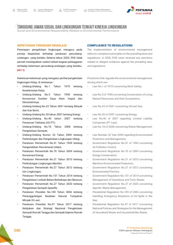 TANGGUNG JAWAB SOSIAL DAN LINGKUNGAN TERKAIT KINERJA LINGKUNGANSocial and Environmental Responsibility Related to Environmental PerformanceCOMPLIANCE TO REGULATIONSThe implementation of environmental management refers to compliance principles on the prevailing laws and regulations. In 2020, PHE never received any sanctions related to alleged violations against the prevailing laws and regulations.Provisions that regulate the environmental management, among which are:%u2022 Law No.1 of 1970 concerning Work Safety;%u2022 Law No.5 of 1990 concerning Conservation of Living Natural Resources and their Ecosystems;%u2022 Law No.22 of 2001 concerning Oil and Gas;%u2022 Law No.30 of 2007 concerning Energy;%u2022 Law No.40 of 2007 regarding Limited Liability Companies (PT Law);%u2022 Law No.18 of 2008 concerning Waste Management;%u2022 Law Number 32 Year 2009 regarding Environmental Protection and Management;%u2022 Government Regulation No.41 of 1999 concerning Air Pollution Control;%u2022 Government Regulation No.70 of 2009 concerning Energy Conservation;%u2022 Government Regulation No.21 of 2010 concerning Maritime Environmental Protection;%u2022 Government Regulation No.27 of 2012 concerning Environmental Permits;%u2022 Government Regulation No.101 of 2014 concerning Management of Hazardous and Toxic Waste;%u2022 Government Regulation No.27 of 2020 concerning Specific Waste Management;%u2022 Presidential Regulation No.109 of 2006 concerning Handling Emergency Situations of Oil Spills in the Sea;%u2022 Presidential Regulation No.97 of 2017 concerning National Policies and Strategies for the Management of Household Waste and Household-like Waste;KEPATUHAN TERHADAP REGULASIPenerapan pengelolaan lingkungan mengacu pada prinsip kepatuhan terhadap peraturan perundangundangan yang berlaku Selama tahun 2020, PHE tidak pernah mendapatkan sanksi terkait dugaan pelanggaran terhadap ketentuan perundang-undangan yang berlaku. [307-1]Ketentuan-ketentuan yang mengatur perihal pengelolaan lingkungan hidup, di antaranya : %u2022 Undang-Undang No.1 Tahun 1970 tentang Keselamatan Kerja;%u2022 Undang-Undang No.5 Tahun 1990 tentang Konservasi Sumber Daya Alam Hayati dan Ekosistemnya;%u2022 Undang-Undang No.22 Tahun 2001 tentang Minyak dan Gas Bumi;%u2022 Undang-Undang No.30 tahun 2007 tentang Energi;%u2022 Undang-Undang No.40 tahun 2007 tentang Perseroan Terbatas (UU PT);%u2022 Undang-Undang No.18 Tahun 2008 tentang Pengelolaan Sampah;%u2022 Undang-Undang Nomor 32 Tahun 2009 tentang Perlindungan dan Pengelolaan Lingkungan Hidup;%u2022 Peraturan Pemerintah No.41 Tahun 1999 tentang Pengendalian Pencemaran Udara;%u2022 Peraturan Pemerintah No.70 Tahun 2009 tentang Konservasi Energi;%u2022 Peraturan Pemerintah No.21 Tahun 2010 tentang Perlindungan Lingkungan Maritim;%u2022 Peraturan Pemerintah No.27 Tahun 2012 tentang Izin Lingkungan;%u2022 Peraturan Pemerintah No.101 Tahun 2014 tentang Pengelolaan Limbah Bahan Berbahaya dan Beracun;%u2022 Peraturan Pemerintah No.27 Tahun 2020 tentang Pengelolaan Sampah Spesifik;%u2022 Peraturan Presiden No.109 Tahun 2006 tentang Penanggulangan Keadaan Darurat Tumpahan Minyak Di Laut;%u2022 Peraturan Presiden No.97 Tahun 2017 tentang Kebijakan dan Strategi Nasional Pengelolaan Sampah Rumah Tangga dan Sampah Sejenis Rumah Tangga;Laporan ManajemenManagement ReportProfil PerusahaanCompany ProfileAnalisa & Diskusi ManajemenManagement Discussion & AnalysisIkhtisar 20202020 HighlightsPT Pertamina Hulu Energi2020 Laporan Tahunan TerintegrasiIntegrated Annual Report 546