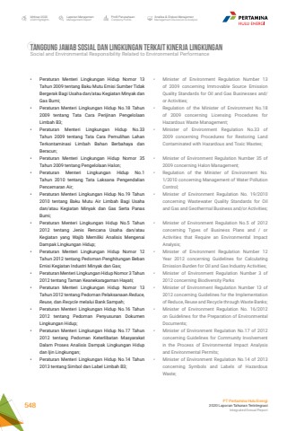 TANGGUNG JAWAB SOSIAL DAN LINGKUNGAN TERKAIT KINERJA LINGKUNGANSocial and Environmental Responsibility Related to Environmental Performance%u2022 Minister of Environment Regulation Number 13 of 2009 concerning Immovable Source Emission Quality Standards for Oil and Gas Businesses and/or Activities;%u2022 Regulation of the Minister of Environment No.18 of 2009 concerning Licensing Procedures for Hazardous Waste Management;%u2022 Minister of Environment Regulation No.33 of 2009 concerning Procedures for Restoring Land Contaminated with Hazardous and Toxic Wastes;%u2022 Minister of Environment Regulation Number 35 of 2009 concerning Halon Management;%u2022 Regulation of the Minister of Environment No. 1/2010 concerning Management of Water Pollution Control;%u2022 Minister of Environment Regulation No. 19/2010 concerning Wastewater Quality Standards for Oil and Gas and Geothermal Business and/or Activities;%u2022 Minister of Environment Regulation No.5 of 2012 concerning Types of Business Plans and / or Activities that Require an Environmental Impact Analysis;%u2022 Minister of Environment Regulation Number 12 Year 2012 concerning Guidelines for Calculating Emission Burden for Oil and Gas Industry Activities;%u2022 Minister of Environment Regulation Number 3 of 2012 concerning Biodiversity Parks%u2022 Minister of Environment Regulation Number 13 of 2012 concerning Guidelines for the Implementation of Reduce, Reuse and Recycle through Waste Banks;%u2022 Minister of Environment Regulation No. 16/2012 on Guidelines for the Preparation of Environmental Documents;%u2022 Minister of Environment Regulation No.17 of 2012 concerning Guidelines for Community Involvement in the Process of Environmental Impact Analysis and Environmental Permits;%u2022 Minister of Environment Regulation No.14 of 2013 concerning Symbols and Labels of Hazardous Waste;%u2022 Peraturan Menteri Lingkungan Hidup Nomor 13 Tahun 2009 tentang Baku Mutu Emisi Sumber Tidak Bergerak Bagi Usaha dan/atau Kegiatan Minyak dan Gas Bumi;%u2022 Peraturan Menteri Lingkungan Hidup No.18 Tahun 2009 tentang Tata Cara Perijinan Pengelolaan Limbah B3; %u2022 Peraturan Menteri Lingkungan Hidup No.33 Tahun 2009 tentang Tata Cara Pemulihan Lahan Terkontaminasi Limbah Bahan Berbahaya dan Beracun; %u2022 Peraturan Menteri Lingkungan Hidup Nomor 35 Tahun 2009 tentang Pengelolaan Halon;%u2022 Peraturan Menteri Lingkungan Hidup No.1 Tahun 2010 tentang Tata Laksana Pengendalian Pencemaran Air;%u2022 Peraturan Menteri Lingkungan Hidup No.19 Tahun 2010 tentang Baku Mutu Air Limbah Bagi Usaha dan/atau Kegiatan Minyak dan Gas Serta Panas Bumi; %u2022 Peraturan Menteri Lingkungan Hidup No.5 Tahun 2012 tentang Jenis Rencana Usaha dan/atau Kegiatan yang Wajib Memiliki Analisis Mengenai Dampak Lingkungan Hidup; %u2022 Peraturan Menteri Lingkungan Hidup Nomor 12 Tahun 2012 tentang Pedoman Penghitungan Beban Emisi Kegiatan Industri Minyak dan Gas;%u2022 Peraturan Menteri Lingkungan Hidup Nomor 3 Tahun 2012 tentang Taman Keanekaragaman Hayati;%u2022 Peraturan Menteri Lingkungan Hidup Nomor 13 Tahun 2012 tentang Pedoman Pelaksanaan Reduce, Reuse, dan Recycle melalui Bank Sampah;%u2022 Peraturan Menteri Lingkungan Hidup No.16 Tahun 2012 tentang Pedoman Penyusunan Dokumen Lingkungan Hidup;%u2022 Peraturan Menteri Lingkungan Hidup No.17 Tahun 2012 tentang Pedoman Keterlibatan Masyarakat Dalam Proses Analisis Dampak Lingkungan Hidup dan Ijin Lingkungan; %u2022 Peraturan Menteri Lingkungan Hidup No.14 Tahun 2013 tentang Simbol dan Label Limbah B3;Laporan ManajemenManagement ReportProfil PerusahaanCompany ProfileAnalisa & Diskusi ManajemenManagement Discussion & AnalysisIkhtisar 20202020 HighlightsPT Pertamina Hulu Energi2020 Laporan Tahunan TerintegrasiIntegrated Annual Report 548