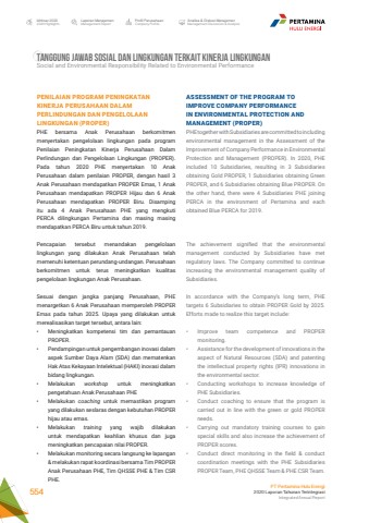 ASSESSMENT OF THE PROGRAM TO IMPROVE COMPANY PERFORMANCE IN ENVIRONMENTAL PROTECTION AND MANAGEMENT (PROPER) PHE together with Subsidiaries are committed to including environmental management in the Assessment of the Improvement of Company Performance in Environmental Protection and Management (PROPER). In 2020, PHE included 10 Subsidiaries, resulting in 3 Subsidiaries obtaining Gold PROPER, 1 Subsidiaries obtaining Green PROPER, and 6 Subsidiaries obtaining Blue PROPER. On the other hand, there were 4 Subsidiaries PHE joining PERCA in the environment of Pertamina and each obtained Blue PERCA for 2019.The achievement signified that the environmental management conducted by Subsidiaries have met regulatory laws. The Company committed to continue increasing the environmental management quality of Subsidiaries.In accordance with the Company%u2019s long term, PHE targets 6 Subsidiaries to obtain PROPER Gold by 2025. Efforts made to realize this target include:%u2022 Improve team competence and PROPER monitoring. %u2022 Assistance for the development of innovations in the aspect of Natural Resources (SDA) and patenting the intellectual property rights (IPR) innovations in the environmental sector.%u2022 Conducting workshops to increase knowledge of PHE Subsidiaries.%u2022 Conduct coaching to ensure that the program is carried out in line with the green or gold PROPER needs.%u2022 Carrying out mandatory training courses to gain special skills and also increase the achievement of PROPER scores. %u2022 Conduct direct monitoring in the field & conduct coordination meetings with the PHE Subsidiaries PROPER Team, PHE QHSSE Team & PHE CSR Team. PENILAIAN PROGRAM PENINGKATAN KINERJA PERUSAHAAN DALAM PERLINDUNGAN DAN PENGELOLAAN LINGKUNGAN (PROPER)PHE bersama Anak Perusahaan berkomitmen menyertakan pengelolaan lingkungan pada program Penilaian Peningkatan Kinerja Perusahaan Dalam Perlindungan dan Pengelolaan Lingkungan (PROPER). Pada tahun 2020 PHE menyertakan 10 Anak Perusahaan dalam penilaian PROPER, dengan hasil 3 Anak Perusahaan mendapatkan PROPER Emas, 1 Anak Perusahaan mendapatkan PROPER Hijau dan 6 Anak Perusahaan mendapatkan PROPER Biru. Disamping itu ada 4 Anak Perusahaan PHE yang mengkuti PERCA dilingkungan Pertamina dan masing masing mendapatkan PERCA Biru untuk tahun 2019.Pencapaian tersebut menandakan pengelolaan lingkungan yang dilakukan Anak Perusahaan telah memenuhi ketentuan perundang-undangan. Perusahaan berkomitmen untuk terus meningkatkan kualitas pengelolaan lingkungan Anak Perusahaan. Sesuai dengan jangka panjang Perusahaan, PHE menargetkan 6 Anak Perusahaan memperoleh PROPER Emas pada tahun 2025. Upaya yang dilakukan untuk merealisasikan target tersebut, antara lain:%u2022 Meningkatkan kompetensi tim dan pemantauan PROPER.%u2022 Pendampingan untuk pengembangan inovasi dalam aspek Sumber Daya Alam (SDA) dan mematenkan Hak Atas Kekayaan Intelektual (HAKI) inovasi dalam bidang lingkungan.%u2022 Melakukan workshop untuk meningkatkan pengetahuan Anak Perusahaan PHE%u2022 Melakukan coaching untuk memastikan program yang dilakukan seslaras dengan kebutuhan PROPER hijau atau emas.%u2022 Melakukan training yang wajib dilakukan untuk mendapatkan keahlian khusus dan juga meningkatkan pencapaian nilai PROPER.%u2022 Melakukan monitoring secara langsung ke lapangan & melakukan rapat koordinasi bersama Tim PROPER Anak Perusahaan PHE, Tim QHSSE PHE & Tim CSR PHE.TANGGUNG JAWAB SOSIAL DAN LINGKUNGAN TERKAIT KINERJA LINGKUNGANSocial and Environmental Responsibility Related to Environmental PerformanceLaporan ManajemenManagement ReportProfil PerusahaanCompany ProfileAnalisa & Diskusi ManajemenManagement Discussion & AnalysisIkhtisar 20202020 HighlightsPT Pertamina Hulu Energi2020 Laporan Tahunan TerintegrasiIntegrated Annual Report 554