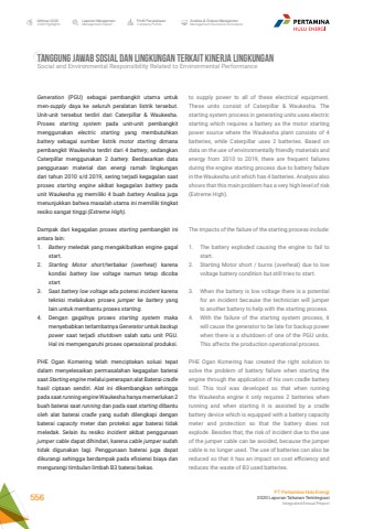 to supply power to all of these electrical equipment. These units consist of Caterpillar & Waukesha. The starting system process in generating units uses electric starting which requires a battery as the motor starting power source where the Waukesha plant consists of 4 batteries, while Caterpillar uses 2 batteries. Based on data on the use of environmentally friendly materials and energy from 2010 to 2019, there are frequent failures during the engine starting process due to battery failure in the Waukesha unit which has 4 batteries. Analysis also shows that this main problem has a very high level of risk (Extreme High).The impacts of the failure of the starting process include:1. The battery exploded causing the engine to fail to start.2. Starting Motor short / burns (overheat) due to low voltage battery condition but still tries to start.3. When the battery is low voltage there is a potential for an incident because the technician will jumper to another battery to help with the starting process.4. With the failure of the starting system process, it will cause the generator to be late for backup power when there is a shutdown of one of the PGU units. This affects the production operational process.PHE Ogan Komering has created the right solution to solve the problem of battery failure when starting the engine through the application of his own cradle battery tool. This tool was developed so that when running the Waukesha engine it only requires 2 batteries when running and when starting it is assisted by a cradle battery device which is equipped with a battery capacity meter and protection so that the battery does not explode. Besides that, the risk of incident due to the use of the jumper cable can be avoided, because the jumper cable is no longer used. The use of batteries can also be reduced so that it has an impact on cost efficiency and reduces the waste of B3 used batteries.Generation (PGU) sebagai pembangkit utama untuk men-supply daya ke seluruh peralatan listrik tersebut. Unit-unit tersebut terdiri dari Caterpillar & Waukesha. Proses starting system pada unit-unit pembangkit menggunakan electric starting yang membutuhkan battery sebagai sumber listrik motor starting dimana pembangkit Waukesha terdiri dari 4 battery, sedangkan Caterpillar menggunakan 2 battery. Berdasarkan data penggunaan material dan energi ramah lingkungan dari tahun 2010 s/d 2019, sering terjadi kegagalan saat proses starting engine akibat kegagalan battery pada unit Waukesha yg memiliki 4 buah battery Analisa juga menunjukkan bahwa masalah utama ini memiliki tingkat resiko sangat tinggi (Extreme High).Dampak dari kegagalan proses starting pembangkit ini antara lain: 1. Battery meledak yang mengakibatkan engine gagal start.2. Starting Motor short/terbakar (overheat) karena kondisi battery low voltage namun tetap dicoba start.3. Saat battery low voltage ada potensi incident karena teknisi melakukan proses jumper ke battery yang lain untuk membantu proses starting.4. Dengan gagalnya proses starting system maka menyebabkan terlambatnya Generator untuk backuppower saat terjadi shutdown salah satu unit PGU. Hal ini mempengaruhi proses operasional produksi.PHE Ogan Komering telah menciptakan solusi tepat dalam menyelesaikan permasalahan kegagalan baterai saat Starting engine melalui penerapan alat Baterai cradlehasil ciptaan sendiri. Alat ini dikembangkan sehingga pada saat running engine Waukesha hanya memerlukan 2 buah baterai saat running dan pada saat starting dibantu oleh alat baterai cradle yang sudah dilengkapi dengan baterai capacity meter dan proteksi agar baterai tidak meledak. Selain itu resiko incident akibat penggunaan jumper cable dapat dihindari, karena cable jumper sudah tidak digunakan lagi. Penggunaan baterai juga dapat dikurangi sehingga berdampak pada efisiensi biaya dan mengurangi timbulan limbah B3 baterai bekas.TANGGUNG JAWAB SOSIAL DAN LINGKUNGAN TERKAIT KINERJA LINGKUNGANSocial and Environmental Responsibility Related to Environmental PerformanceLaporan ManajemenManagement ReportProfil PerusahaanCompany ProfileAnalisa & Diskusi ManajemenManagement Discussion & AnalysisIkhtisar 20202020 HighlightsPT Pertamina Hulu Energi2020 Laporan Tahunan TerintegrasiIntegrated Annual Report 556