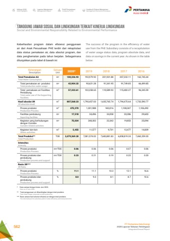 TANGGUNG JAWAB SOSIAL DAN LINGKUNGAN TERKAIT KINERJA LINGKUNGANSocial and Environmental Responsibility Related to Environmental PerformanceThe success of the program in the efficiency of water use from the PHE Subsidiary consists of a recapitulation of water usage status data, program absolute data, and data on savings in the current year. As shown in the table beloKeberhasilan program dalam efisiensi penggunaan air dari Anak Perusahaan PHE terdiri dari rekapitulasi data status pemakaian air, data absolut program, dan data penghematan pada tahun berjalan. Sebagaimana ditunjukkan pada tabel di bawah ini:KeteranganDescriptionSatuanUnit 2020* 2019 2018 2017 2016Total Pemakaian AirTotal Water Consumptionm3 100,336.93 192,979.92 201,931.88 207,232.11 162,745.44Total pemakaian air produksiTotal production water usagem3 42,904.32 90,621.28 91,341.95 91,749.85 66,499.85Total pemakaian air Fasilitas PendukungTotal water use of the Supporting Facilitiesm3 57,433.61 102,358.65 110,589.93 115,482.27 96,245.59Hasil absolut 3R3R absolute resultm3 807,568.23 1,790,457.03 1,635,765.74 1,794,475.64 1,732,590.77Proses produksiProduction Processm3 475,270 1,001,988 943,016 1,108,347 1,106,492 Fasilitas pendukungSuporting facilitiesm3 17,518 34,496 34,058 33,286 29,603 Kegiatan yang berhubungan dengan ComdevComdev-related activitiesm3 75,024 248,302 22,342 19,853 25,094 Kegiatan lain-lainOthers activitiesm3 5,455 11,577 9,731 12,477 14,839 Total Produksi**Total ProductionTOE 3,479,369.30 7,081,574.02 7,683,881.83 6,858,819.24 7,460,259.20 IntensitasIntensityProses produksiProduction Processm3/TOE 0.06 0.06 0.06 0.07 0.06Proses produksi dan pendukungProduction process and support m3/TOE 0.23 0.21 0.19 0.22 0.20Rasio 3R***3R RatioProses produksiProduction Process% 11.1 11.1 10.3 12.1 16.6Proses produksi dan pendukungProduction process and support % 8.0 9.3 8.1 8.7 10.6* Data sampai dengan bulan Juni 2020. Data as of June 2020.** Total penggunaan air dibandingkan dengan total produksi. Total water usage compared to total production.*** Rasio antara hasil absolut efisiensi air dengan total produksi. The ratio between the absolute yield of water efficiency and total production.Laporan ManajemenManagement ReportProfil PerusahaanCompany ProfileAnalisa & Diskusi ManajemenManagement Discussion & AnalysisIkhtisar 20202020 HighlightsPT Pertamina Hulu Energi2020 Laporan Tahunan TerintegrasiIntegrated Annual Report 562