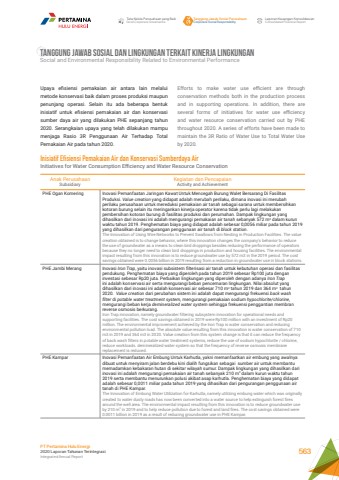 TANGGUNG JAWAB SOSIAL DAN LINGKUNGAN TERKAIT KINERJA LINGKUNGANSocial and Environmental Responsibility Related to Environmental PerformanceEfforts to make water use efficient are through conservation methods both in the production process and in supporting operations. In addition, there are several forms of initiatives for water use efficiency and water resource conservation carried out by PHE throughout 2020. A series of efforts have been made to maintain the 3R Ratio of Water Use to Total Water Use by 2020.Upaya efisiensi pemakaian air antara lain melalui metode konservasi baik dalam proses produksi maupun penunjang operasi. Selain itu ada beberapa bentuk inisiatif untuk efisiensi pemakaian air dan konservasi sumber daya air yang dilakukan PHE sepanjang tahun 2020. Serangkaian upaya yang telah dilakukan mampu menjaga Rasio 3R Penggunaan Air Terhadap Total Pemakaian Air pada tahun 2020.Anak PerusahaanSubsidiaryKegiatan dan PencapaianActivity and AchievementPHE Ogan Komering Inovasi Pemanfaatan Jaringan Kawat Untuk Mencegah Burung Walet Bersarang Di Fasilitas Produksi. Value creation yang didapat adalah merubah perilaku, dimana inovasi ini merubah perilaku perusahaan untuk mereduksi pemakaian air tanah sebagai sarana untuk membersihkan kotoran burung selain itu meringankan kinerja operator karena tidak perlu lagi melakukan pembersihan kotoran burung di fasilitas produksi dan perumahan. Dampak lingkungan yang dihasilkan dari inovasi ini adalah mengurangi pemakaian air tanah sebanyak 572 m3 dalam kurun waktu tahun 2019. Penghematan biaya yang didapat adalah sebesar 0,0056 miliar pada tahun 2019 yang dihasilkan dari pengurangan penggunaan air tanah di block station.The Innovation of Using Wire Networks to Prevent Swallows from Nesting in Production Facilities. The value creation obtained is to change behavior, where this innovation changes the company's behavior to reduce the use of groundwater as a means to clean bird droppings besides reducing the performance of operators because they no longer need to clean bird droppings in production and housing facilities. The environmental impact resulting from this innovation is to reduce groundwater use by 572 m3 in the 2019 period. The cost savings obtained were 0.0056 billion in 2019 resulting from a reduction in groundwater use in block stations.PHE Jambi Merang Inovasi Iron Trap, yaitu inovasi subsistem filterisasi air tanah untuk kebutuhan operasi dan fasilitas pendukung. Penghematan biaya yang diperoleh pada tahun 2019 sebesar Rp100 juta dengan investasi sebesar Rp20 juta. Perbaikan lingkungan yang diperoleh dengan adanya Iron Trapini adalah konservasi air serta mengurangi beban pencemaran lingkungan. Nilai absolut yang dihasilkan dari inovasi ini adalah konservasi air sebesar 710 m3 tahun 2019 dan 364 m3 tahun 2020. Value creation dari perubahan sistem ini adalah dapat mengurangi frekuensi back wash filter di potable water treatment system, mengurangi pemakaian sodium hypochlorite/chlorine,mengurangi beban kerja demineralized water system sehingga frekuensi penggantian membran reverse osmosis berkurang.Iron Trap innovation, namely groundwater filtering subsystem innovation for operational needs and supporting facilities. The cost savings obtained in 2019 were Rp100 million with an investment of Rp20 million. The environmental improvement achieved by the Iron Trap is water conservation and reducing environmental pollution load. The absolute value resulting from this innovation is water conservation of 710 m3 in 2019 and 364 m3 in 2020. Value creation from this system change is that it can reduce the frequency of back wash filters in potable water treatment systems, reduce the use of sodium hypochlorite / chlorine, reduce workloads. demineralized water system so that the frequency of reverse osmosis membrane replacement is reduced.PHE Kampar Inovasi Pemanfaatan Air Embung Untuk Karhutla, yakni memanfaatkan air embung yang awalnya dibuat untuk menyiram jalan berdebu kini dialih fungsikan sebagai sumber air untuk membantu memadamkan kebakaran hutan di sekitar wilayah sumur. Dampak lingkungan yang dihasilkan dari inovasi ini adalah mengurangi pemakaian air tanah sebanyak 210 m3 dalam kurun waktu tahun 2019 serta membantu menurunkan polusi akibat asap karhutla. Penghematan biaya yang didapat adalah sebesar 0,0011 miliar pada tahun 2019 yang dihasilkan dari pengurangan penggunaan air tanah di PHE Kampar.The Innovation of Embung Water Utilization for Karhutla, namely utilizing embung water which was originally created to water dusty roads has now been converted into a water source to help extinguish forest fires around the well area. The environmental impact resulting from this innovation is to reduce groundwater use by 210 m3 in 2019 and to help reduce pollution due to forest and land fires. The cost savings obtained were 0.0011 billion in 2019 as a result of reducing groundwater use in PHE Kampar.Inisiatif Efisiensi Pemakaian Air dan Konservasi Sumberdaya AirInitiatives for Water Consumption Efficiency and Water Resource ConservationTata Kelola Perusahaan yang BaikGood Corporate GovernanceTanggung Jawab Sosial PerusahaanCorporate Social ResponsibilityLaporan Keuangan KonsolidasianConsolidated Financial ReportPT Pertamina Hulu Energi2020 Laporan Tahunan TerintegrasiIntegrated Annual Report 563