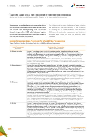 The efforts made to reduce the burden of water pollution are adjusted to the characteristics of the operation and working area of each Subsidiaries. Until the end of 2020, several wastewater management and treatment activities were carried out and the utilization value obtained.Upaya-upaya yang dilakukan untuk menurunkan beban pencemaran air disesuaikan dengan karakteristik operasi dan wilayah kerja masing-masing Anak Perusahaan. Sampai dengan akhir 2020, ada beberapa kegiatan pengelolaan dan pengolahan air limbah yang dilakukan dan nilai pemanfaatan yang didapat. TANGGUNG JAWAB SOSIAL DAN LINGKUNGAN TERKAIT KINERJA LINGKUNGANSocial and Environmental Responsibility Related to Environmental PerformanceKegiatan Pengurangan Beban Pencemaran Air Tahun 2020 dan PencapaiannyaWater Pollution Burden Reduction Activities in 2020 and Its AchievementsAnak PerusahaanSubsidiaryKegiatan dan PencapaianActivity and AchievementPHE Ogan Komering Inovasi Pemanfaatan Arang Batok OK Untuk Menurunkan Kadar Besi Air Sumur. Dampak lingkungan yang dihasilkan dari inovasi ini adalah mengurangi beban pencemaran besi yang diterima oleh tanah sebesar 0,015 ton dalam kurun waktu tahun 2019. Penghematan biaya yang didapat adalah sebesar 0,005 miliar pada tahun 2019 yang dihasilkan dari penghematan biaya pembelian dan instalasi filter air.The Innovation of Using OK Shell Charcoal to Reduce the Iron Level of Well Water. The environmental impact resulting from this innovation is to reduce the iron pollution load received by the soil by 0.015 tonnes in 2019. The cost savings obtained are 0.005 billion in 2019 resulting from savings in the purchase and installation of water filters.PHE Jambi Merang Inovasi filterisasi air Rapampa ini adalah filterisasi air limbah domestik. Inovasi ini merupakan perubahan subsistem, yaitu dengan mengoptimasi filter air limbah domestik. Inovasi ini merupakan pioner dan telah mendapatkan paten dengan nomor IDS000002433. Penghematan biaya yang diperoleh pada tahun 2019 sebesar Rp25,2 juta dengan investasi sebesar Rp6 juta. Dampak lingkungan yang dihasilkan dari inovasi ini adalah penurunan beban pencemaran sebesar 1,19 ton tahun 2019 dan 0,29 ton tahun 2020.This Rapampa water filtering innovation is the filtering of domestic wastewater. This innovation is a subsystem change, namely by optimizing the domestic wastewater filter. This innovation is a pioneer and has received a patent with the number IDS000002433. The cost savings obtained in 2019 were Rp25.2 million with an investment of Rp6 million. The environmental impact resulting from this innovation is a decrease in pollution load by 1.19 tons in 2019 and 0.29 tons in 2020.PHE Kampar Inovasi Air berputar untuk menurunkan minyak air terproduksi, yaitu air sebelum diinjeksikan diputarkan terlebih dahulu dengan kecepatan tertentu sehingga minyak bisa terpisahkan di dalam pipa injeksi. Adapun kemampuan air berputar menurunkan minyak di dalam air terproduksi bisa mencapai 1-2%. PHE Kampar berhasil menurunkan beban pencemaran minyak sebesar 1,28 ton pada 2019. Dampak lingkungan yang dihasilkan dari inovasi ini adalah mengurangi beban pencemar minyak sebanyak 1,28 ton dalam kurun waktu tahun 2019. Penghematan biaya yang didapat adalah sebesar 0,0035 milyar pada tahun 2019 yang dihasilkan dari pengurangan biaya pengolahan minyak di air terproduksi.Innovation Water spins to reduce produced water oil, that is, water before injection is rotated at a certain speed so that oil can be separated in the injection pipe. The ability of rotating water to reduce oil in the produced water can reach 1-2%. PHE Kampar succeeded in reducing the oil pollution load by 1.28 tonnes in 2019. The environmental impact resulting from this innovation was to reduce the oil pollutant load by 1.28 tonnes in 2019. The cost savings obtained amounted to 0.0035 billion in the year 2019 resulting from a reduction in the cost of processing oil in produced water.PHE NSO Inovasi Penurunan Beban Pencemar Air dengan %u201cMetode Adjusting Flow Control Valve Opener (Chocke Valve)%u201d. Inovasi ini merupakan hal baru dalam dunia proper dan belum terdaftar di buku best practice dalam industri proper 2018. Inovasi ini tidak membutuhkan investasi namun berhasil melakukan penghematan biaya sebesar Rp3.546.190.302 di tahun 2020. Dampak lingkungan yang dihasilkan berupa penurunan beban pencemar sebesar 4,30 ton. Water Pollutant Load Reduction Innovation with \Method\oks in the 2018 proper industry. This innovation does not require investment but has succeeded in saving costs of Rp3,546,190,302 in 2020. The resulting environmental impact is a reduction in pollutant loads by 4,30 tons.Laporan ManajemenManagement ReportProfil PerusahaanCompany ProfileAnalisa & Diskusi ManajemenManagement Discussion & AnalysisIkhtisar 20202020 HighlightsPT Pertamina Hulu Energi2020 Laporan Tahunan TerintegrasiIntegrated Annual Report 566
