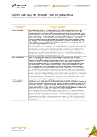 TANGGUNG JAWAB SOSIAL DAN LINGKUNGAN TERKAIT KINERJA LINGKUNGANSocial and Environmental Responsibility Related to Environmental PerformanceAnak PerusahaanSubsidiaryKegiatan dan PencapaianActivity and AchievementPHE Jambi Merang Gerobak Cleaning Center (GCC) adalah suatu alat yang dapat membersihkan spare part yang kotor sehingga dapat mengurangi penggunaan kain majun. Fungsi utama GCC adalah untuk membersihkan spare parts yang terkena debu, oli, ataupun minyak dengan menggunakan solvent.Dengan adanya inovasi ini, maka dapat mengurangi pembelian kain majun sekaligus limbah kain majun yang dihasilkan. Dampak lingkungan dari program GCC ini telah berhasil mengurangi limbah B3 kain majun, dengan nilai absolut sebesar 0,44 Ton pada tahun 2020 Inovasi GCC ini telah memiliki Hak Cipta dengan nomor pencatatan 000157055. Anggaran inovasi ini adalah sebesar Rp5.000.000,-, namun berhasil menghasilkan penghematan biaya sebesar Rp190.494.000,- pada tahun 2020 dari efisiensi pengelolaan limbah B3 kain majun. Inovasi GCC ini telah memiliki Hak Cipta dengan nomor pencatatan 000157055.Gerobak Cleaning Center (GCC) is a tool that can clean dirty spare parts so as to reduce the use of rags. The main function of GCC is to clean spare parts that are exposed to dust, oil or oil by using solvent. With this innovation, it can reduce the purchase of cloth rags as well as the waste of cloth rags produced. The environmental impact of this GCC program has succeeded in reducing the B3 waste of cloth rags, with an absolute value of 0.44 tons in 2020. This GCC innovation has a Copyright with registration number 000157055. This innovation budget is Rp5,000,000, but it works resulting in cost savings of Rp190,494,000 in 2020 from the efficiency of B3 waste management of cloth majun. This GCC innovation already has a Copyright with the registration number 000157055.PHE Ogan Komering PHE OK telah menciptakan solusi tepat dalam menyelesaikan permasalahan kegagalan baterai saat Starting engine melalui penerapan alat Baterai cradle hasil ciptaan sendiri. Alat ini dikembangkan sehingga pada saat running engine Waukesha hanya memerlukan 2 buah baterai saat running dan pada saat starting dibantu oleh alat baterai cradle yang sudah dilengkapi dengan baterai capacity meter dan proteksi agar baterai tidak meledak. Selain itu resiko incident akibat penggunaan jumper cable dapat dihindari, karena cable jumper sudah tidak digunakan lagi. Penggunaan baterai juga dapat dikurangi sehingga berdampak pada efisiensi biaya dan mengurangi timbulan limbah B3 baterai bekas sebesar 0,05 Ton dalam kurun waktu tahun 2019.PHE OK has created the right solution in solving the problem of battery failure when starting the engine through the application of the battery cradle tool created by itself. This tool was developed so that when running the Waukesha engine it only requires 2 batteries when running and when starting it is assisted by a cradle battery device which is equipped with a battery capacity meter and protection so that the battery does not explode. Besides that, the risk of incident due to the use of the jumper cable can be avoided, because the jumper cable is no longer used. The use of batteries can also be reduced so that it has an impact on cost efficiency and reduces the waste of B3 used batteries by 0.05 tons in 2019.PHE West Madura Offshore (WMO)Wasiat (Wall Wash Internal Clean Up TGRS) merupakan inovasi sub system pada proses pembersihan TGRS untuk mengatasi penumpukan material kontaminan serta mengurangi timbulan limbah glycol bekas. Dampak Lingkungan yang dihasilkan dari inovasi ini adalah penurunan limbah glycol bekas mencapai 1 Ton pada tahun 2019. Penghematan total biaya yang diperoleh inovasi Wasiat sebesar Rp8.469.500 (yang diperoleh dari pengurangan biaya pengolahan, transportasi dan penyimpanan limbah di TPS LB3). Wasiat sudah mendapatkan pengakuan kekayaan intelektual dari Kementerian Hukum dan HAM dengan Sertifikat Hak Cipta No. 000205892.Wasiat (Wall Wash Internal Clean Up TGRS) is a sub system innovation in the TGRS cleaning process to overcome the buildup of contaminant materials and reduce the generation of used glycol waste. The environmental impact resulting from this innovation is a reduction in used glycol waste by up to 1 ton in 2019. The total cost savings obtained by the Wasiat innovation amounted to Rp8,469,500 (obtained from reducing the cost of processing, transportation and storage of waste at TPS LB3). Wasiat has received intellectual property recognition from the Ministry of Law and Human Rights with a Copyright Certificate No. 000205892.Tata Kelola Perusahaan yang BaikGood Corporate GovernanceTanggung Jawab Sosial PerusahaanCorporate Social ResponsibilityLaporan Keuangan KonsolidasianConsolidated Financial ReportPT Pertamina Hulu Energi2020 Laporan Tahunan TerintegrasiIntegrated Annual Report 569