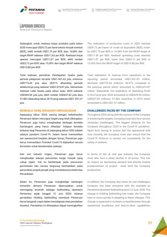 Tata Kelola Perusahaan yang BaikGood Corporate GovernanceTanggung Jawab Sosial PerusahaanCorporate Social ResponsibilityLaporan Keuangan KonsolidasianConsolidated Financial ReportPT Pertamina Hulu Energi2020 Laporan Tahunan TerintegrasiIntegrated Annual Report 57Sedangkan untuk realisasi biaya produksi pada tahun 2020 mencapai USD9,73 per barel setara minyak mentah (BOE), lebih rendah USD1,70 per BOE atau 14,88% dari target RKAP sebesar USD11,43 per BOE. Realisasi biaya operasi mencapai USD11,67 per BOE, lebih rendah USD2,12 per BOE atau 15,39% dari target RKAP sebesar USD13,80 per BOE.Total realisasi perolehan Pendapatan Usaha pada periode pelaporan tercatat USD1.901,43 juta, menurun USD773,44 juta atau 28,91% dibanding periode sebelumnya yang sebesar USD2.674,87 juta. Sementara realisasi Laba Usaha pada tahun buku 2020 sebesar USD449,54 juta juta, lebih rendah USD607,82 juta atau 57,48% dibanding tahun 2019 yang sebesar USD1.057,37 juta.KENDALA YANG DIHADAPI PERUSAHAANSepanjang tahun 2020, seiring dengan keberhasilan Perseroan dalam mencapai target yang telah ditetapkan, Perseroan juga harus menghadapi berbagai kendala (tantangan) yang harus dihadapi. Adapun kendala terbesar bagi Perseroan di sepanjang tahun 2020 adalah adanya pandemi Covid-19. Selain harus memastikan sisi operasional berjalan dengan lancar, Perseroan juga harus memastikan Protokol Covid-19 dijalankan secara konsisten untuk keselamatan pekerja.Dari sisi industri migas, Perseroan juga harus menghadapi adanya penurunan harga minyak yang cukup tajam. Hal ini berdampak pada penurunan permintaan dan secara langsung berimplikasi pada penundaan proyek-proyek yang membatasi produktivitas Perusahaan.Selain itu, Perseroan juga menghadapi tantangan tersendiri dimana Perseroan dipercayakan untuk memegang amanah sebagai Subholding Upstream Pertamina sejak tanggal 12 Juni 2020. Adanya perubahan Holding Subholding membuat Perseroan harus bergerak cepat dalam beradaptasi atas perubahan tersebut. Perubahan ini diharapkan dapat meningkatkan The realization of production costs in 2020 reached USD9.73 per barrel of crude oil equivalent (BOE), lower by USD1.70 per BOE or 14.88% from the RKAP target of USD11.43 per BOE. Realized operating costs reached USD11.67 per BOE, lower than USD2.12 per BOE or 15.39% from the RKAP target of USD13.80 per BOE.Total realization of revenue from operations in the reporting period amounted USD1,901.43 million, decrease USD773.44 millionor 28.91% compared to the previous period which amounted to USD2,674.87 million. Meanwhile, the realization of Operating Profit in the Fiscal year 2020 amounted to USD449.54 million, USD607.82 millionor 57.48% lowerthan in 2019 which amounted to USD1,057.37 million.CHALLENGES FACED BY THE COMPANYThroughout 2020, along with the success of the Company in achieving the targets, Company must also face various obstacles (challenges). The biggest obstacle for the Company throughout 2020 is the Covid-19 pandemic. Apart from having to ensure that the operational side runs moothly, the Company must also ensure that the Covid-19 Protocol is carried out consistently for the safety of workers.In terms of the oil and gas industry, the Company must also face a sharp decline in oil prices. This has an impact on decreasing demand and directly implies postponement of project sand limit the Company productivity.In addition, the Company also faces its own challenges, Company has been entrusted with the mandate as Pertamina Upstream Subholding since 12 June 2020. The change in Holding Subholding has made the Company have to move quickly in adapting to these changes. This change is expected to increase competitiveness through operational excellence and best-in-class capabilities, Laporan direksiBoard of Director%u2019s Report