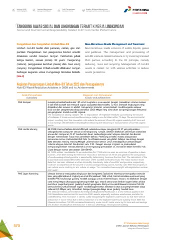 TANGGUNG JAWAB SOSIAL DAN LINGKUNGAN TERKAIT KINERJA LINGKUNGANSocial and Environmental Responsibility Related to Environmental PerformanceNon-Hazardous Waste Management and TreatmentNon-hazardous waste consists of solids, liquids, gases and particles. The management and processing of non-B3 waste is carried out alone or by involving licensed third parties, according to the 3R principle, namely reducing, reuse and recycling. Management of non-B3 waste is carried out with various activities to reduce waste generation.Pengelolaan dan Pengolahan Limbah Non-B3Limbah non-B3 terdiri dari padatan, cairan, gas dan partikel. Pengelolaan dan pengolahan limbah non-B3 dilakukan sendiri maupun dengan melibatkan pihak ketiga berizin, sesuai prinsip 3R yakni mengurangi (reduce), penggunaan kembali (reuse) dan daur ulang (recycle). Pengelolaan limbah non-B3 dilakukan dengan berbagai kegiatan untuk mengurangi timbulan limbah.[306-2]Kegiatan Pengurangan Limbah Non-B3 Tahun 2020 dan PencapaiannyaNon-B3 Waste Reduction Activities in 2020 and Its AchievementsAnak PerusahaanSubsidiaryKegiatan dan PencapaianActivity and AchievementPHE Kampar Inovasi penambahan katalis 185 untuk degradasi sisa sayuran dengan menaikkan volume molase 2 kali lebih banyak dan menjadi pupuk siap pakai dalam waktu 72 hari. Dampak lingkungan yang dihasilkan dari inovasi ini adalah mengurangi timbulan jumlah limbah non B3 organik sebesar 0,62 ton dan penghematan biaya sebesar 0,005 Milyar yang dihasilkan dari pengurangan frekuensi pengangkutan limbah non B3 organik.The innovation of adding catalyst 185 for degradation of vegetable residues by increasing the volume of molasses 2 times as much and becoming a ready-to-use fertilizer within 72 days. The environmental impact resulting from this innovation is to reduce the amount of non-B3 organic waste by 0.62 tons and a cost savings of 0.005 billion resulting from reducing the frequency of transportation of non-B3 organic waste.PHE Jambi Merang BE PURE memanfaatkan Limbah Minyak Jelantah sebagai pengganti Oli 2T yang digunakan sebagai bahan campuran bensin di mesin potong rumput. Setelah dilakukan penentuan viskositas acuan dari campuran Oli 2T dan bensin dicari perbandingan dari Minyak Jelantah dan Bensin dengan menentukan fraksi massa terlebih dahulu. Perhitungan fraksi massa didapat dari penurunan rumus metode Gambill Data hasil fraksi massa yang telah didapat lalu dibagi dengan data densitas masing masing Minyak Jelantah dan bensin untuk mendapatkan perbandingan volume Minyak Jelantah dan Bensin yaitu 1:20. Dengan adanya program ini, maka dapat mengurangi limbah minyak jelantah dan mengurangi pemakaian oli. Inovasi ini telah memiliki Hak Cipta dengan nomor pencatatan 000156951.BE PURE utilizes Used Waste Oil as a substitute for 2T Oil which is used as a mixture of gasoline in lawn mowers. After determining the reference viscosity of the mixture of 2T Oil and gasoline, the comparison of used cooking oil and gasoline is searched by determining the mass fraction first. The calculation of the mass fraction is obtained from the derivation of the Gambill method formula. The mass fraction result data that has been obtained are then divided by the density data of used WV and gasoline, respectively, to obtain a comparison of the volume of used cooking oil and gasoline, namely 1:20. With this program, it can reduce waste cooking oil and reduce oil usage. This innovation has copyright with registration number 000156951.PHE Ogan Komering Metode lntexwar merupakan singkatan dari Integrated Explosives Warehouse merupakan metode baru yang diterapkan di lingkungan Anak Perusahaan PHE untuk memaksimalkan aset-aset yang dimiliki PHE khususnya gudang handak dan juga untuk efisiensi biaya. Inovasi ini dilakukan dengan cara mengintegrasikan gudang bahan peledak agar terjadi penurunan limbah logam bekas akibat membuat pagar bangunan gudang handak yang baru. Dengan inovasi lntexwar ini maka PHE OK berhasil menurunkan limbah logam non B3 logam bekas sebesar 0,4 ton dan penghematan biaya sebesar 0,5 Milyar yang dihasilkan dari pengurangan biaya sewa gedung handak baru.The lntexwar method, which stands for Integrated Explosives Warehouse, is a new method applied in the PHE Subsidiaries environment to maximize PHE's assets, especially explosive warehouses, and also for cost efficiency. This innovation is carried out by integrating the explosives warehouse so that there will be a reduction in waste metal due to the construction of a new explosive warehouse building fence. With this lntexwar innovation, PHE OK succeeded in reducing waste non-B3 metal waste by 0.4 tons and cost savings of 0.5 billion resulting from the reduction in the cost of renting a new explosive building.Laporan ManajemenManagement ReportProfil PerusahaanCompany ProfileAnalisa & Diskusi ManajemenManagement Discussion & AnalysisIkhtisar 20202020 HighlightsPT Pertamina Hulu Energi2020 Laporan Tahunan TerintegrasiIntegrated Annual Report 570