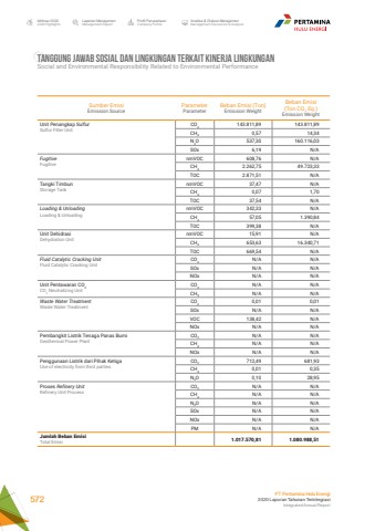 Sumber EmisiEmission SourceParameterParameterBeban Emisi (Ton)Emission WeightBeban Emisi (Ton CO2 Eq.)Emission WeightUnit Penangkap SulfurSulfur Filter UnitCO2 143.811,89 143.811,89CH4 0,57 14,34N2O 537,30 160.116,03SOx 6,19 N/AFugitiveFugitivenmVOC 608,76 N/ACH4 2.262,75 49.723,33TOC 2.871,51 N/ATangki TimbunStorage TanknmVOC 37,47 N/ACH4 0,07 1,70TOC 37,54 N/ALoading & UnloadingLoading & UnloadingnmVOC 342,33 N/ACH4 57,05 1.390,84TOC 399,38 N/AUnit DehidrasiDehydration UnitnmVOC 15,91 N/ACH4 653,63 16.340,71TOC 669,54 N/AFluid Catalytic Cracking UnitFluid Catalytic Cracking UnitCO2 N/A N/ASOx N/A N/ANOx N/A N/AUnit Pentawaran CO2CO2 Neutralizing UnitCO2 N/A N/ACH4 N/A N/AWaste Water TreatmentWaste Water TreatmentCO2 0,01 0,01SOx N/A N/AVOC 138,42 N/ANOx N/A N/APembangkit Listrik Tenaga Panas BumiGeothermal Power PlantCO2 N/A N/ACH4 N/A N/ANOx N/A N/APenggunaan Listrik dari Pihak KetigaUse of electricity from third partiesCO2 712,49 681,93CH4 0,01 0,35N2O 0,10 28,95Proses Refinery UnitRefinery Unit ProcessCO2 N/A N/ACH4 N/A N/AN2O N/A N/ASOx N/A N/ANOx N/A N/APM N/A N/AJumlah Beban EmisiTotal Emisi 1.017.570,81 1.080.988,51TANGGUNG JAWAB SOSIAL DAN LINGKUNGAN TERKAIT KINERJA LINGKUNGANSocial and Environmental Responsibility Related to Environmental PerformanceLaporan ManajemenManagement ReportProfil PerusahaanCompany ProfileAnalisa & Diskusi ManajemenManagement Discussion & AnalysisIkhtisar 20202020 HighlightsPT Pertamina Hulu Energi2020 Laporan Tahunan TerintegrasiIntegrated Annual Report 572