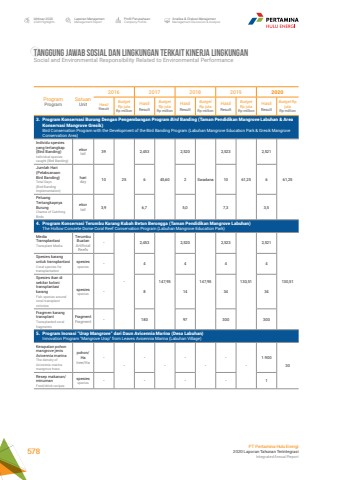 ProgramProgramSatuanUnit2016 2017 2018 2019 2020HasilResultBudget Rp jutaRp millionHasilResultBudget Rp jutaRp millionHasilResultBudget Rp jutaRp millionHasilResultBudget Rp jutaRp millionHasilResultBudget Rp jutaRp million3. Program Konservasi Burung Dengan Pengembangan Program Bird Banding (Taman Pendidikan Mangrove Labuhan & Area Konservasi Mangrove Gresik)Bird Conservation Program with the Development of the Bird Banding Program (Labuhan Mangrove Education Park & Gresik Mangrove Conservation Area)Individu spesies yang tertangkap (Bird Banding)Individual species caught (Bird Banding)ekortail 39252,45345,602,520Swadana2,52361,252,52161,25Jumlah Hari (PelaksanaanBird Banding)Total Days (Bird Banding Implementation)hariday 10 6 2 10 6Peluang Tertangkapnya BurungChance of Catching Birdsekortail 3,9 6,7 5,0 7,3 3,54. Program Konservasi Terumbu Karang Kubah Beton Berongga (Taman Pendidikan Mangrove Labuhan)The Hollow Concrete Dome Coral Reef Conservation Program (Labuhan Mangrove Education Park)Media TransplantasiTransplant MediaTerumbu BuatanArtificial Reefs--2,453147,95 2,520147,95 2,523130,512,521130,51Spesies karang untuk transplantasiCoral species for transplantationspesiesspecies - 4 4 4 4Spesies ikan di sekitar koloni transplantasi karangFish species around coral transplant coloniesspesiesspecies - 8 14 34 34Fragmen karang transplantTransplanted coral fragmentsFragmentFragment - 180 97 300 3005. Program Inovasi %u201cUrap Mangrove%u201d dari Daun Avicennia Marina (Desa Labuhan)Innovation Program \Kerapatan pohon mangrove jenis Avicennia marinaThe density of Avicennia marina mangrove treespohon/Hatree/Ha--------1.90030Resep makanan/minumanFood/drink recipesspesiesspecies - - - - 1TANGGUNG JAWAB SOSIAL DAN LINGKUNGAN TERKAIT KINERJA LINGKUNGANSocial and Environmental Responsibility Related to Environmental PerformanceLaporan ManajemenManagement ReportProfil PerusahaanCompany ProfileAnalisa & Diskusi ManajemenManagement Discussion & AnalysisIkhtisar 20202020 HighlightsPT Pertamina Hulu Energi2020 Laporan Tahunan TerintegrasiIntegrated Annual Report 578
