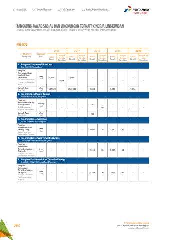 ProgramProgramSatuanUnit2016 2017 2018 2019 2020HasilResultBudget Rp jutaRp millionHasilResultBudget Rp jutaRp millionHasilResultBudget Rp jutaRp millionHasilResultBudget Rp jutaRp millionHasilResultBudget Rp jutaRp million1. Program Konservasi Ikan Laut Sea Fish ConservationProgram Konservasi Ikan Laut di Pulau SeunudonSea Fish Conservation Program on Seunudon Islandikanfish 0,96650,580,966 ------Jumlah IkanTotal Fishekortail 19.610,22 19.610,22 9.000 9.250 9.3502. Program Identifikasi Burung Bird Identification ProgramProgram Identifikasi Burung di Wilayah NSOBird Identification Program at NSO Areaburungbird ----3,43250----Jumlah AvesTotal Avesekortail - - 702 - -3. Program Konservasi Ikan Fish Conservation ProgramProgram Konservasi Ikan Karang TongKarang Tong Fish Conservation Programikanfish - - - - 2.982 28 2.992 30 - -4. Program Konservasi Terumbu Karang Coral Reef Conservation ProgramProgram Konservasi Terumbu Karang TeungohTeungoh Coral Reef Conservation Programjenistype - - - - 1.513 32 1.815 34 - -5. Program Konservasi Ikan Terumbu Karang Coral Reef Fish Conservation ProgramProgram Konservasi Terumbu Karang TeungohTeungoh Coral Reef Fish Conservation Programikanfish - - - - 2.339 30 1,99 32 - -TANGGUNG JAWAB SOSIAL DAN LINGKUNGAN TERKAIT KINERJA LINGKUNGANSocial and Environmental Responsibility Related to Environmental PerformancePHE NSOLaporan ManajemenManagement ReportProfil PerusahaanCompany ProfileAnalisa & Diskusi ManajemenManagement Discussion & AnalysisIkhtisar 20202020 HighlightsPT Pertamina Hulu Energi2020 Laporan Tahunan TerintegrasiIntegrated Annual Report 582