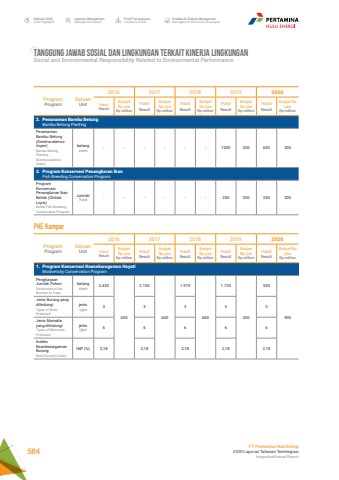 ProgramProgramSatuanUnit2016 2017 2018 2019 2020HasilResultBudget Rp jutaRp millionHasilResultBudget Rp jutaRp millionHasilResultBudget Rp jutaRp millionHasilResultBudget Rp jutaRp millionHasilResultBudget Rp jutaRp million2. Penanaman Bambu Betung Bambu Betung PlantingPenanaman Bambu Betung (Dendrocalamus Asper)Bambu Betung Planting (Dendrocalamus Asper)batangstem - - - - - - 1200 200 600 2003. Program Konservasi Penangkaran Ikan Fish Breeding Conservation ProgramProgram Konservasi Penangkaran Ikan Belida (Chitala Lopis)Belida Fish Breeding Conservation ProgramJumlahTotal - - - - - - 250 200 250 200TANGGUNG JAWAB SOSIAL DAN LINGKUNGAN TERKAIT KINERJA LINGKUNGANSocial and Environmental Responsibility Related to Environmental PerformanceProgramProgramSatuanUnit2016 2017 2018 2019 2020HasilResultBudget Rp jutaRp millionHasilResultBudget Rp jutaRp millionHasilResultBudget Rp jutaRp millionHasilResultBudget Rp jutaRp millionHasilResultBudget Rp jutaRp million1. Program Konservasi Keanekaragaman HayatiBiodiversity Conservation ProgramPengkayaan Jumlah PohonEnrichment of the Number of Trees batangstem 3.4306002.1506001.9756001.735300555900Jenis Burung yang dilindungiTypes of Birds Protectedjenistype 3 3 3 3 3Jenis Mamalia yang dilindungiTypes of Mammals Protectedjenistype 6 6 6 6 6Indeks Keankearagaman BurungBirds Diversity IndexINP (%) 2,18 2,18 2,18 2,18 2,18PHE KamparLaporan ManajemenManagement ReportProfil PerusahaanCompany ProfileAnalisa & Diskusi ManajemenManagement Discussion & AnalysisIkhtisar 20202020 HighlightsPT Pertamina Hulu Energi2020 Laporan Tahunan TerintegrasiIntegrated Annual Report 584