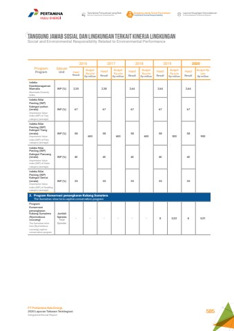 TANGGUNG JAWAB SOSIAL DAN LINGKUNGAN TERKAIT KINERJA LINGKUNGANSocial and Environmental Responsibility Related to Environmental PerformanceProgramProgramSatuanUnit2016 2017 2018 2019 2020HasilResultBudget Rp jutaRp millionHasilResultBudget Rp jutaRp millionHasilResultBudget Rp jutaRp millionHasilResultBudget Rp jutaRp millionHasilResultBudget Rp jutaRp millionIndeks Keankearagaman MamaliaMammals Diversity IndexINP (%) 2,356002,386002,646002,643002,64900Indeks Nilai Penting (INP) Kategori pohon (rerata)Importance Value Index (INP) of Tree category (average)INP (%) 67 67 67 67 67Indeks Nilai Penting (INP) Kategori Tiang (rerata)Importance Value Index (INP) of Pole category (average)INP (%) 58 58 58 58 58Indeks Nilai Penting (INP) Kategori Pancang (rerata)Importance Value Index (INP) of Stake category (average)INP (%) 40 40 40 40 40Indeks Nilai Penting (INP) Kategori Semai (rerata)Importance Value Index (INP) of Seedling category (average)INP (%) 35 35 35 35 352. Program Konservasi penangkaran Kukang Sumatera The Sumatran slow loris captive conservation programProgram Konservasi penangkaran Kukang Sumatera (Nycticebous coucang)The Sumatran slow loris (Nycticebous coucang) captive conservation programJumlah SpesiesTotal Species- - - - - - 8 0,02 8 0,01Tata Kelola Perusahaan yang BaikGood Corporate GovernanceTanggung Jawab Sosial PerusahaanCorporate Social ResponsibilityLaporan Keuangan KonsolidasianConsolidated Financial ReportPT Pertamina Hulu Energi2020 Laporan Tahunan TerintegrasiIntegrated Annual Report 585