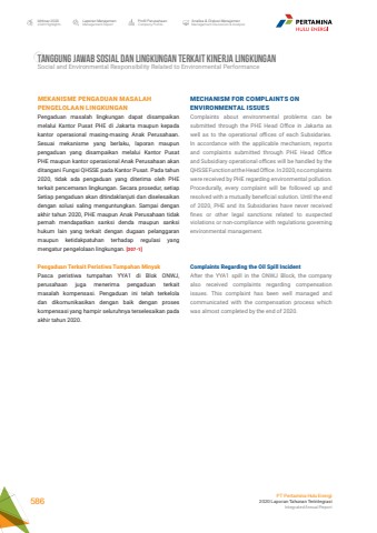 TANGGUNG JAWAB SOSIAL DAN LINGKUNGAN TERKAIT KINERJA LINGKUNGANSocial and Environmental Responsibility Related to Environmental PerformanceMECHANISM FOR COMPLAINTS ON ENVIRONMENTAL ISSUESComplaints about environmental problems can be submitted through the PHE Head Office in Jakarta as well as to the operational offices of each Subsidaries. In accordance with the applicable mechanism, reports and complaints submitted through PHE Head Office and Subsidiary operational offices will be handled by the QHSSE Function at the Head Office. In 2020, no complaints were received by PHE regarding environmental pollution. Procedurally, every complaint will be followed up and resolved with a mutually beneficial solution. Until the end of 2020, PHE and its Subsidiaries have never received fines or other legal sanctions related to suspected violations or non-compliance with regulations governing environmental management.Complaints Regarding the Oil Spill IncidentAfter the YYA1 spill in the ONWJ Block, the company also received complaints regarding compensation issues. This complaint has been well managed and communicated with the compensation process which was almost completed by the end of 2020.MEKANISME PENGADUAN MASALAH PENGELOLAAN LINGKUNGANPengaduan masalah lingkungan dapat disampaikan melalui Kantor Pusat PHE di Jakarta maupun kepada kantor operasional masing-masing Anak Perusahaan. Sesuai mekanisme yang berlaku, laporan maupun pengaduan yang disampaikan melalui Kantor Pusat PHE maupun kantor operasional Anak Perusahaan akan ditangani Fungsi QHSSE pada Kantor Pusat. Pada tahun 2020, tidak ada pengaduan yang diterima oleh PHE terkait pencemaran lingkungan. Secara prosedur, setiap Setiap pengaduan akan ditindaklanjuti dan diselesaikan dengan solusi saling menguntungkan. Sampai dengan akhir tahun 2020, PHE maupun Anak Perusahaan tidak pernah mendapatkan sanksi denda maupun sanksi hukum lain yang terkait dengan dugaan pelanggaran maupun ketidakpatuhan terhadap regulasi yang mengatur pengelolaan lingkungan. [307-1]Pengaduan Terkait Peristiwa Tumpahan MinyakPasca peristiwa tumpahan YYA1 di Blok ONWJ, perusahaan juga menerima pengaduan terkait masalah kompensasi. Pengaduan ini telah terkelola dan dikomunikasikan dengan baik dengan proses kompensasi yang hampir seluruhnya terselesaikan pada akhir tahun 2020.Laporan ManajemenManagement ReportProfil PerusahaanCompany ProfileAnalisa & Diskusi ManajemenManagement Discussion & AnalysisIkhtisar 20202020 HighlightsPT Pertamina Hulu Energi2020 Laporan Tahunan TerintegrasiIntegrated Annual Report 586