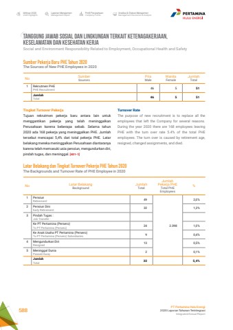 TANGGUNG JAWAB SOSIAL DAN LINGKUNGAN TERKAIT KETENAGAKERJAAN,KESELAMATAN DAN KESEHATAN KERJA Social and Environment Responsibility Related to Employment, Occupational Health and SafetyTurnover RateThe purpose of new recruitment is to replace all the employees that left the Company for several reasons. During the year 2020 there are 168 employees leaving PHE with the turn over rate 5.4% of the total PHE employees. The turn over is caused by retirement age, resigned, changed assignments, and died. Sumber Pekerja Baru PHE Tahun 2020The Sources of New PHE Employees in 2020No Sumber SourcesPriaMaleWanitaFemaleJumlahTotal1 Rekrutmen PHEPHE Recruitment 46 5 51JumlahTotal 46 5 51Tingkat Turnover Pekerja Tujuan rekrutmen pekerja baru antara lain untuk menggantikan pekerja yang telah meninggalkan Perusahaan karena beberapa sebab. Selama tahun 2020 ada 168 pekerja yang meninggalkan PHE. Jumlah tersebut mencapai 5,4% dari total pekerja PHE. Latar belakang mereka meninggalkan Perusahaan diantaranya karena telah memasuki usia pensiun, mengundurkan diri, pindah tugas, dan meninggal. [401-1]Latar Belakang dan Tingkat Turnover Pekerja PHE Tahun 2020The Backgrounds and Turnover Rate of PHE Employee in 2020No Latar BelakangBackgroundJumlahTotalJumlah Pekerja PHETotal PHE Employees%1 PensiunRetirement 492.3982,0%2 Pensiun DiniEarly Retirement 32 1,3%3 Pindah Tugas :Job Transfer :Ke PT Pertamina (Persero)To PT Pertamina (Persero) 24 1,0%Ke Anak Usaha PT Pertamina (Persero)To PT Pertamina (Persero) Subsidiaries 9 0,4%4 Mengundurkan DiriResigned 13 0,5%5 Meninggal DuniaPassed Away 2 0,1%JumlahTotal 32 5,4%Laporan ManajemenManagement ReportProfil PerusahaanCompany ProfileAnalisa & Diskusi ManajemenManagement Discussion & AnalysisIkhtisar 20202020 HighlightsPT Pertamina Hulu Energi2020 Laporan Tahunan TerintegrasiIntegrated Annual Report 588