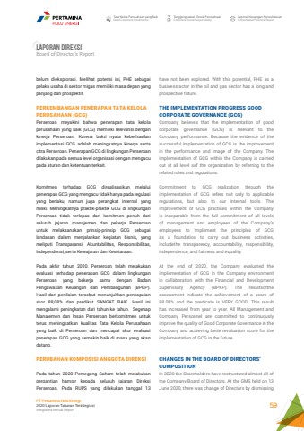 Tata Kelola Perusahaan yang BaikGood Corporate GovernanceTanggung Jawab Sosial PerusahaanCorporate Social ResponsibilityLaporan Keuangan KonsolidasianConsolidated Financial ReportPT Pertamina Hulu Energi2020 Laporan Tahunan TerintegrasiIntegrated Annual Report 59belum dieksplorasi. Melihat potensi ini, PHE sebagai pelaku usaha di sektor migas memiliki masa depan yang panjang dan prospektif.PERKEMBANGAN PENERAPAN TATA KELOLA PERUSAHAAN (GCG)Perseroan meyakini bahwa penerapan tata kelola perusahaan yang baik (GCG) memiliki relevansi dengan kinerja Perseroan. Karena bukti nyata keberhasilan implementasi GCG adalah meningkatnya kinerja serta citra Perseroan. Penerapan GCG di lingkungan Perseroan dilakukan pada semua level organisasi dengan mengacu pada aturan dan ketentuan terkait.Komitmen terhadap GCG direalisasikan melalui penerapan GCG yang mengacu tidak hanya pada regulasi yang berlaku, namun juga perangkat internal yang miliki. Meningkatnya praktik-praktik GCG di lingkungan Perseroan tidak terlepas dari komitmen penuh dari seluruh jajaran manajemen dan pekerja Perseroan untuk melaksanakan prinsip-prinsip GCG sebagai landasan dalam menjalankan kegiatan bisnis, yang meliputi Transparansi, Akuntabilitas, Responsibilitas, Independensi, serta Kewajaran dan Kesetaraan.Pada akhir tahun 2020, Perseroan telah melakukan evaluasi terhadap penerapan GCG dalam lingkungan Perseroan yang bekerja sama dengan Badan Pengawasan Keuangan dan Pembangunan (BPKP). Hasil dari penilaian tersebut menunjukkan pencapaian skor 88,08% dan predikat SANGAT BAIK. Hasil ini mengalami peningkatan dari tahun ke tahun. Segenap Manajemen dan Insan Perseroan berkomitmen untuk terus meningkatkan kualitas Tata Kelola Perusahaan yang baik di Perseroan dan mencapai skor evaluasi penerapan GCG yang semakin baik di masa yang akan datang.PERUBAHAN KOMPOSISI ANGGOTA DIREKSIPada tahun 2020 Pemegang Saham telah melakukan pergantian hampir kepada seluruh jajaran Direksi Perseroan. Pada RUPS yang dilakukan tanggal 13 have not been explored. With this potential, PHE as a business actor in the oil and gas sector has a long and prospective future.THE IMPLEMENTATION PROGRESS GOOD CORPORATE GOVERNANCE (GCG)Company believes that the implementation of good corporate governance (GCG) is relevant to the Company performance. Because the evidence of the successful implementation of GCG is the improvement in the performance and image of the Company. The implementation of GCG within the Company is carried out at all level sof the organization by referring to the related rules and regulations.Commitment to GCG realization through the implementation of GCG refers not only to applicable regulations, but also to our internal tools. The improvement of GCG practices within the Company is inseparable from the full commitment of all levels of management and employees of the Company%u2019s employees to implement the principles of GCG as a foundation to carry out business activities, includethe transparency, accountability, responsibility, independence, and fairness and equality.At the end of 2020, the Company evaluated the implementation of GCG in the Company environment in collaboration with the Financial and Development Supervisory Agency (BPKP). The resultsofthe assessment indicate the achievement of a score of 88.08% and the predicate is VERY GOOD. This result has increased from year to year. All Management and Company Personnel are committed to continuously improve the quality of Good Corporate Governance in the Company and achieving bette revaluation score for the implementation of GCG in the future.CHANGES IN THE BOARD OF DIRECTORS%u2019 COMPOSITIONIn 2020 the Shareholders have restructured almost all of the Company Board of Directors. At the GMS held on 13 June 2020, there was change of Directors by dismissing Laporan direksiBoard of Director%u2019s Report