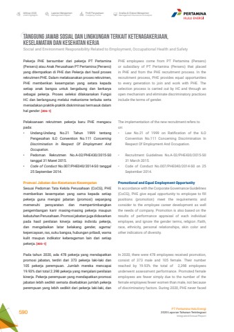 PHE employees come from PT Pertamina (Persero) or subsidiary of PT Pertamina (Persero) that placed in PHE and from the PHE recruitment process. In the recruitment process, PHE provides equal opportunities to every generation to join and work with PHE. The selection process is carried out by HC and through an open mechanism and eliminate discriminatory practices include the terms of gender. The implementation of the new recruitment refers toon:%u2022 Law No.21 of 1999 on Ratification of the ILO Convention No.111 Concerning Discrimination In Respect Of Employment And Occupation.%u2022 Recruitment Guidelines No.A-02/PHE430/2015-S0 31 March 2015.%u2022 Code of Conduct No.007/PHE040/2014-S0 on 25 September 2014.Promotional and Equal Employment OpportunityIn accordance with the Corporate Governance Guidelines (CoCG), PHE give equal opportunity to employee to fill positions (promotion) meet the requirements and consider to the employee career development as well the needs of company. Promotion is also based on the results of performance appraisal of each individual employee, and ignore the gender terms, religion /faith, race, ethnicity, personal relationships, skin color and other indicators of diversity.In 2020, there were 478 employees received promotion, consist of 373 male and 105 female. Their number reached by 19.93% the total of 2,398 employees underwent assessment performance. Promoted female employees are fewer simply due to the number of the female employees fewer women than male, not because of discriminatory factors. During 2020, PHE never faced Pekerja PHE bersumber dari pekerja PT Pertamina (Persero) atau Anak Perusahaan PT Pertamina (Persero)yang ditempatkan di PHE dan Pekerja dari hasil proses rekrutmen PHE. Dalam melaksanakan proses rekrutmen, PHE memberikan kesempatan yang setara kepada setiap anak bangsa untuk bergabung dan berkarya sebagai pekerja. Proses seleksi dilaksanakan Fungsi HC dan berlangsung melalui mekanisme terbuka serta meniadakan praktik-praktik diskriminasi termasuk dalam hal gender. [406-1]Pelaksanaan rekrutmen pekerja baru PHE mengacu pada:%u2022 Undang-Undang No.21 Tahun 1999 tentang Pengesahan ILO Convention No.111 Concerning Discrimination In Respect Of Employment And Occupation.%u2022 Pedoman Rekrutmen No.A-02/PHE430/2015-S0 tanggal 31 Maret 2015.%u2022 Code of Conduct No.007/PHE040/2014-S0 tanggal 25 September 2014.Promosi Jabatan dan Kesetaraan Kesempatan Sesuai Pedoman Tata Kelola Perusahaan (CoCG), PHE memberikan kesempatan yang sama kepada setiap pekerja guna mengisi jabatan (promosi) sepanjang memenuhi persyaratan dan mempertimbangkan pengembangan karir masing-masing pekerja maupun kebutuhan Perusahaan. Promosi jabatan juga didasarkan pada hasil penilaian kinerja setiap individu pekerja, dan mengabaikan latar belakang gender, agama/kepercayaan, ras, suku bangsa, hubungan pribadi, warna kulit maupun indikator keberagaman lain dari setiap pekerja. [405-1]Pada tahun 2020, ada 478 pekerja yang mendapatkan promosi jabatan, terdiri dari 373 pekerja laki-laki dan 105 pekerja perempuan. Jumlah mereka mencapai 19.93% dari total 2.398 pekerja yang menjalani penilaian kinerja. Pekerja perempuan yang mendapatkan promosi jabatan lebih sedikit semata disebabkan jumlah pekerja perempuan yang lebih sedikit dari pekerja laki-laki, dan TANGGUNG JAWAB SOSIAL DAN LINGKUNGAN TERKAIT KETENAGAKERJAAN,KESELAMATAN DAN KESEHATAN KERJA Social and Environment Responsibility Related to Employment, Occupational Health and SafetyLaporan ManajemenManagement ReportProfil PerusahaanCompany ProfileAnalisa & Diskusi ManajemenManagement Discussion & AnalysisIkhtisar 20202020 HighlightsPT Pertamina Hulu Energi2020 Laporan Tahunan TerintegrasiIntegrated Annual Report 590
