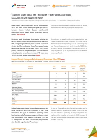 complaints lawsuits related to alleged practices related discrimination in the employee promotion process. Commitment to equal employment opportunities and careers for every employee, be a form of support PHE in the SDGs achievement, namely Goal 5: Gender Equality and Women Empowerment. Until the end of 2020 the amount of female employees in managerial positions as company officials up to 18 people or 10.22% of the total company officials.As one of the employee development strategies and to meet the needs of organizations in PHE, subsidiaries andalso PT Pertamina (Persero) in total, Companies also implement the mutation or transfer. In 2020 there are 33 PHE and Subsidiaries employee are muta or transferred from the Company.bukan karena faktor diskriminatif gender. Selama tahun 2020, PHE tidak pernah dihadapkan pada pengaduan/tuntutan hukum terkait dugaan praktik-praktik diskriminasi terkait dalam proses penentuan promosi pekerja. [406-1][404-3]Komitmen pada kesetaraan kesempatan bekerja dan berkarir kepada setiap pekerja, menjadi bentuk dukungan PHE pada pencapaian SDGs, yakni Tujuan 5: Kesetaraan Gender dan Memberdayakan Kaum Perempuan. Secara keseluruhan sampai dengan akhir tahun 2020 jumlah pekerja perempuan yang berada pada posisi manajerial sebagai pejabat perusahaan mencapai 18 orang atau 10,22% dari total pejabat perusahaan. [SDG5] Proporsi Pekerja Perempuan Pada Manajerial Perusahaan Tahun 2020 [SDG5]Number of Female Employees on Managerial Position in the Company in 2020JabatanPositionPriaMaleWanitaFemaleJumlahTotalPekerja Wanita (%)Female EmployeeDireksi Board of Directors 6 0 6 0%General ManagerGeneral Manager 6 - 6 0%Vice PresidentVice President 19 2 21 10%AdvisorAdvisor 16 0 16 0%Manager/SetaraManager/Equivalent 129 16 145 11%Ass. Manager/SetaraAssistant Manager/Equivalent 172 46 218 21%Staf SeniorSenior Staff 266 45 311 14%Staf Staff 1,386 289 1675 17%JumlahTotal 2,000 398 2398 17%Sebagai salah satu strategi pengembangan pekerja dan untuk memenuhi kebutuhan organisasi di PHE, Anak Perusahaan dan juga PT Pertamina (Persero) secara keseluruhan, maka Perusahaan Juga melakukan mutasi atau perpindahan tugas pekerja. Pada tahun 2020 ada 33 pekerja PHE dan Anak Perusahaan yang dimutasi atau dipindah tugaskan dari Perusahaan.TANGGUNG JAWAB SOSIAL DAN LINGKUNGAN TERKAIT KETENAGAKERJAAN,KESELAMATAN DAN KESEHATAN KERJA Social and Environment Responsibility Related to Employment, Occupational Health and SafetyTata Kelola Perusahaan yang BaikGood Corporate GovernanceTanggung Jawab Sosial PerusahaanCorporate Social ResponsibilityLaporan Keuangan KonsolidasianConsolidated Financial ReportPT Pertamina Hulu Energi2020 Laporan Tahunan TerintegrasiIntegrated Annual Report 591