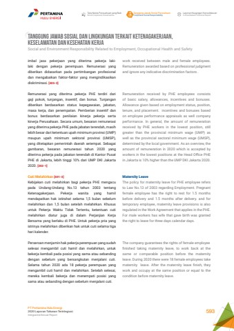 work received between male and female employees. Remuneration awarded based on professional judgment and ignore any indicative discrimination factors .Remuneration received by PHE employees consists of basic salary, allowances, incentives and bonuses. Allowance given based on employment status, position, tenure, and placement. incentives and bonuses based on employee performance appraisals as well company performance. In general, the amount of remuneration received by PHE workers in the lowest position, still greater than the provincial minimum wage (UMP) as well as the provincial sectoral minimum wage (UMSP), determined by the local government. As an overview, the amount of remuneration in 2020 which is accepted by workers in the lowest positions at the Head Office PHE in Jakarta is 10% higher than the UMP DKI Jakarta 2020.Maternity Leave The policy for maternity leave for PHE employee refers to Law No.13 of 2003 regarding Employment. Pregnant female employee has the right to rest for 1.5 months before delivery and 1.5 months after delivery. and for temporary employee, maternity leave provisions is also regulated in the Work Agreement that applies in the PHE. For male workers has wife that gave birth was granted the right to leave for three days calendar days.The company guarantees the rights of female employeefinished taking maternity leave, to work back at the same or comparable position before the maternity leave. During 2020 there were 18 female employees take maternity leave. After the maternity leave finish, they work and occupy at the same position or equal to the condition before maternity leave.imbal jasa pekerjaan yang diterima pekerja lakilaki dengan pekerja perempuan. Remunerasi yang diberikan didasarkan pada pertimbangan profesional dan mengabaikan faktor-faktor yang mengindikasikan diskriminasi. [405-2]Remunerasi yang diterima pekerja PHE terdiri dari gaji pokok, tunjangan, insentif, dan bonus. Tunjangan diberikan berdasarkan status kepegawaian, jabatan, masa kerja, dan penempatan. Pemberian insentif dan bonus berdasarkan penilaian kinerja pekerja serta kinerja Perusahaan. Secara umum, besaran remunerasi yang diterima pekerja PHE pada jabatan terendah, masih lebih besar dari ketentuan upah minimum provinsi (UMP) maupun upah minimum sektoral provinsi (UMSP), yang ditetapkan pemerintah daerah setempat. Sebagai gambaran, besaran remunerasi tahun 2020 yang diterima pekerja pada jabatan terendah di Kantor Pusat PHE di Jakarta, lebih tinggi 10% dari UMP DKI Jakarta 2020. [202-1]Cuti Melahirkan [401-3]Kebijakan cuti melahirkan bagi pekerja PHE mengacu pada Undang-Undang No.13 tahun 2003 tentang Ketenagakerjaan. Pekerja wanita yang hamil mendapatkan hak istirahat selama 1,5 bulan sebelum melahirkan dan 1,5 bulan setelah melahirkan. Khusus untuk Pekerja Waktu Tidak Tertentu, ketentuan cuti melahirkan diatur juga di dalam Perjanjian Kerja Bersama yang berlaku di PHE. Untuk pekerja pria yang istrinya melahirkan diberikan hak untuk cuti selama tiga hari kalender.Perseroan menjamin hak pekerja perempuan yang sudah selesai mengambil cuti hamil dan melahirkan, untuk bekerja kembali pada posisi yang sama atau sebanding dengan sebelum yang bersangkutan menjalani cuti. Selama tahun 2020 ada 18 pekerja perempuan yang mengambil cuti hamil dan melahirkan. Setelah selesai, mereka kembali bekerja dan menempati posisi yang sama atau sebanding dengan sebelum menjalani cuti.TANGGUNG JAWAB SOSIAL DAN LINGKUNGAN TERKAIT KETENAGAKERJAAN,KESELAMATAN DAN KESEHATAN KERJA Social and Environment Responsibility Related to Employment, Occupational Health and SafetyTata Kelola Perusahaan yang BaikGood Corporate GovernanceTanggung Jawab Sosial PerusahaanCorporate Social ResponsibilityLaporan Keuangan KonsolidasianConsolidated Financial ReportPT Pertamina Hulu Energi2020 Laporan Tahunan TerintegrasiIntegrated Annual Report 593