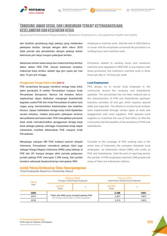 employee in overtime work. Until the end of 2020 there is no issue with the employee concerned the provisions on working hours and overtime work.Provisions related to working hours and maximum overtime work regulated in PKB PHE. In accordance with these provisions, the maximum overtime work is three hours per day or 14 hours per week.Local EmploymentPHE always try to recruit local employee in the community around the company and Subsidiaries operates. The recruitment has not been realized due to the characteristics of PHE and Subsidiaries upstream business activities oil and gas which requires special skills and expertise. The efforts to involve local workers were implemented through certain types of work and engagement with local suppliers. PHE requires local suppliers to maximize the use of local labor, so that the community feel the benefits of the existence of PHE and subsidiaries.Consider to the coverage of PHE working area in the entire area of Indonesia, the company interprets local employees as Indonesian citizen (WNI) who works at PHE and Subsidiaries. Until the end of reporting period, the number of PHE employees reached 2,398 people and many of them are Indonesian citizens.dan fasilitas pendukung bagi pekerja yang melakukan pekerjaan lembur. Sampai dengan akhir tahun 2020 tidak pernah ada perselisihan dengan pekerja terkait ketentuan jam kerja maupun pekerjaan lembur. Ketentuan terkait waktu kerja dan maksimal kerja lembur diatur dalam PKB PHE. Sesuai ketentuan tersebut, maksimal kerja lembur adalah tiga jam nyata per hari atau 14 jam per minggu.Penggunaan Tenaga Kerja Lokal [203-2]PHE senantiasa berupaya merekrut tenaga kerja lokal, yakni penduduk di sekitar Perusahaan maupun Anak Perusahaan beroperasi. Namun hal tersebut belum sepenuhnya dapat dilakukan mengingat karakteristik kegiatan usaha PHE dan Anak Perusahaan di sektor hulu migas yang membutuhkan keterampilan dan keahlian khusus. Upaya melibatkan tenaga kerja lokal dijalankan secara terbatas, melalui jenis-jenis pekerjaan tertentu dan pelibatan pemasok lokal. PHE mewajibkan pemasok lokal untuk memaksimalkan penggunaan tenaga kerja lokal sebagai pekerja, sehingga masyarakat tetap dapat merasakan manfaat keberadaan PHE maupun Anak Perusahaan. Mengingat cakupan WK PHE meliputi seluruh wilayah Indonesia, Perusahaan memaknai pekerja lokal juga sebagai Warga Negara Indonesia (WNI) yang bekerja di PHE dan AP. Sampai dengan akhir periode pelaporan, jumlah pekerja PHE mencapai 2.398 orang. Dari jumlah tersebut sebanyak keseluruhannya merupakan WNI.Jumlah Pekerja Berdasarkan Status KewarganegaraanTotal Employees Based on Citizenship StatusTahunYearPekerja WNAForeign Citizenship EmployeePekerja WNIIndonesian Citizenship EmployeeJumlahTotal % JumlahTotal %2020Tidak ada WNA yang menjadi pekerja PHENo Foreign Citizenship as PHE employees2.398 100%2019 2.437 100%2018 2.315 100%TANGGUNG JAWAB SOSIAL DAN LINGKUNGAN TERKAIT KETENAGAKERJAAN,KESELAMATAN DAN KESEHATAN KERJA Social and Environment Responsibility Related to Employment, Occupational Health and SafetyTata Kelola Perusahaan yang BaikGood Corporate GovernanceTanggung Jawab Sosial PerusahaanCorporate Social ResponsibilityLaporan Keuangan KonsolidasianConsolidated Financial ReportPT Pertamina Hulu Energi2020 Laporan Tahunan TerintegrasiIntegrated Annual Report 595
