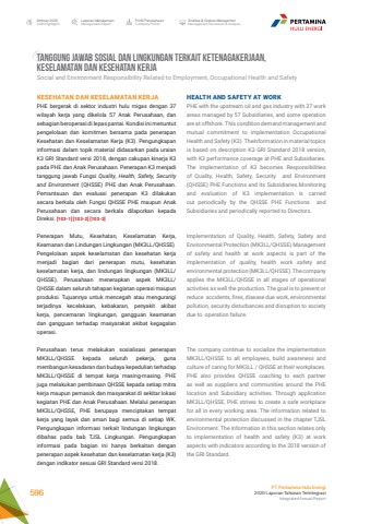HEALTH AND SAFETY AT WORKPHE with the upstream oil and gas industry with 37 work areas managed by 57 Subsidiaries, and some operation are at offshore. This condition demand management and mutual commitment to implementation Occupational Health and Safety (K3). Theinformation in material topics is based on description K3 GRI Standard 2018 version, with K3 performance coverage at PHE and Subsidiaries. The implementation of K3 becomes Responsibilities of Quality, Health, Safety, Security and Environment (QHSSE) PHE Functions and its Subsidiaries.Monitoring and evaluation of K3 implementation is carried out periodically by the QHSSE PHE Functions and Subsidiaries and periodically reported to Directors. Implementation of Quality, Health, Safety, Safety and Environmental Protection (MK3LL/QHSSE) Management of safety and health at work aspects is part of the implementation of quality, health work safety and environmental protection (MK3LL/QHSSE). The company applies the MK3LL/QHSSE in all stages of operational activities as well the production. The goal is to prevent or reduce accidents, fires, disease due work, environmental pollution, security disturbances and disruption to society due to operation failure.The company continue to socialize the implementation MK3LL/QHSSE to all employees, build awareness and culture of caring for MK3LL / QHSSE at their workplaces. PHE also provides QHSSE coaching to each partner as well as suppliers and communities around the PHE location and Subsidiary activities. Through application MK3LL/QHSSE, PHE strives to create a safe workplace for all in every working area. The information related to environmental protection discussed in the chapter TJSL Environment. The information in this section relates only to implementation of health and safety (K3) at work aspects with indicators according to the 2018 version of the GRI Standard.KESEHATAN DAN KESELAMATAN KERJAPHE bergerak di sektor industri hulu migas dengan 37 wilayah kerja yang dikelola 57 Anak Perusahaan, dan sebagian beroperasi di lepas pantai. Kondisi ini menuntut pengelolaan dan komitmen bersama pada penerapan Kesehatan dan Keselamatan Kerja (K3). Pengungkapan informasi dalam topik material didasarkan pada uraian K3 GRI Standard versi 2018, dengan cakupan kinerja K3 pada PHE dan Anak Perusahaan. Penerapan K3 menjadi tanggung jawab Fungsi Quality, Health, Safety, Security and Environment (QHSSE) PHE dan Anak Perusahaan. Pemantauan dan evaluasi penerapan K3 dilakukan secara berkala oleh Fungsi QHSSE PHE maupun Anak Perusahaan dan secara berkala dilaporkan kepada Direksi. [103-1] [103-2] [103-3]Penerapan Mutu, Kesehatan, Keselamatan Kerja, Keamanan dan Lindungan Lingkungan (MK3LL/QHSSE)Pengelolaan aspek keselamatan dan kesehatan kerja menjadi bagian dari penerapan mutu, kesehatan keselamatan kerja, dan lindungan lingkungan (MK3LL/QHSSE). Perusahaan menerapkan aspek MK3LL/QHSSE dalam seluruh tahapan kegiatan operasi maupun produksi. Tujuannya untuk mencegah atau mengurangi terjadinya kecelakaan, kebakaran, penyakit akibat kerja, pencemaran lingkungan, gangguan keamanan dan gangguan terhadap masyarakat akibat kegagalan operasi. Perusahaan terus melakukan sosialisasi penerapan MK3LL/QHSSE kepada seluruh pekerja, guna membangun kesadaran dan budaya kepedulian terhadap MK3LL/QHSSE di tempat kerja masing-masing. PHE juga melakukan pembinaan QHSSE kepada setiap mitra kerja maupun pemasok dan masyarakat di sekitar lokasi kegiatan PHE dan Anak Perusahaan. Melalui penerapan MK3LL/QHSSE, PHE berupaya menciptakan tempat kerja yang layak dan aman bagi semua di setiap WK. Pengungkapan informasi terkait lindungan lingkungan dibahas pada bab TJSL Lingkungan. Pengungkapan informasi pada bagian ini hanya berkaitan dengan penerapan aspek kesehatan dan keselamatan kerja (K3) dengan indikator sesuai GRI Standard versi 2018.TANGGUNG JAWAB SOSIAL DAN LINGKUNGAN TERKAIT KETENAGAKERJAAN,KESELAMATAN DAN KESEHATAN KERJA Social and Environment Responsibility Related to Employment, Occupational Health and SafetyLaporan ManajemenManagement ReportProfil PerusahaanCompany ProfileAnalisa & Diskusi ManajemenManagement Discussion & AnalysisIkhtisar 20202020 HighlightsPT Pertamina Hulu Energi2020 Laporan Tahunan TerintegrasiIntegrated Annual Report 596