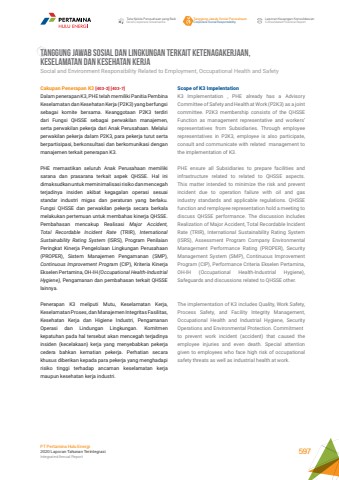 Scope of K3 Impelentation K3 Implementation , PHE already has a Advisory Committee of Safety and Health at Work (P2K3) as a joint committee. P2K3 membership consists of the QHSSE Function as management representative and workers%u2019 representatives from Subsidiaries. Through employee representatives in P2K3, employee is also participate, consult and communicate with related management to the implementation of K3.PHE ensure all Subsidiaries to prepare facilities and infrastructure related to related to QHSSE aspects. This matter intended to minimize the risk and prevent incident due to operation failure with oil and gas industry standards and applicable regulations. QHSSE function and remployee representation hold a meeting to discuss QHSSE performance. The discussion includes Realization of Major Accident, Total Recordable Incident Rate (TRIR), International Sustainability Rating System (ISRS), Assessment Program Company Environmental Management Performance Rating (PROPER), Security Management System (SMP), Continuous Improvement Program (CIP), Performance Criteria Ekselen Pertamina, OH-IH (Occupational Health-Industrial Hygiene), Safeguards and discussions related to QHSSE other.The implementation of K3 includes Quality, Work Safety, Process Safety, and Facility Integrity Management, Occupational Health and Industrial Hygiene, Security Operations and Environmental Protection. Commitmentto prevent work incident (accident) that caused the employee injuries and even death. Special attention given to employees who face high risk of occupational safety threats as well as industrial health at work.Cakupan Penerapan K3 [403-2] [403-7]Dalam penerapan K3, PHE telah memiliki Panitia Pembina Keselamatan dan Kesehatan Kerja (P2K3) yang berfungsi sebagai komite bersama. Keanggotaan P2K3 terdiri dari Fungsi QHSSE sebagai perwakilan manajemen, serta perwakilan pekerja dari Anak Perusahaan. Melalui perwakilan pekerja dalam P2K3, para pekerja turut serta berpartisipasi, berkonsultasi dan berkomunikasi dengan manajemen terkait penerapan K3. PHE memastikan seluruh Anak Perusahaan memiliki sarana dan prasarana terkait aspek QHSSE. Hal ini dimaksudkan untuk meminimalisasi risiko dan mencegah terjadinya insiden akibat kegagalan operasi sesuai standar industri migas dan peraturan yang berlaku. Fungsi QHSSE dan perwakilan pekerja secara berkala melakukan pertemuan untuk membahas kinerja QHSSE. Pembahasan mencakup Realisasi Major Accident, Total Recordable Incident Rate (TRIR), International Sustainability Rating System (ISRS), Program Penilaian Peringkat Kinerja Pengelolaan Lingkungan Perusahaan (PROPER), Sistem Manajemen Pengamanan (SMP), Continuous Improvement Program (CIP), Kriteria Kinerja Ekselen Pertamina, OH-IH (Occupational Health-Industrial Hygiene), Pengamanan dan pembahasan terkait QHSSE lainnya.Penerapan K3 meliputi Mutu, Keselamatan Kerja, Keselamatan Proses, dan Manajemen Integritas Fasilitas, Kesehatan Kerja dan Higiene Industri, Pengamanan Operasi dan Lindungan Lingkungan. Komitmen kepatuhan pada hal tersebut akan mencegah terjadinya insiden (kecelakaan) kerja yang menyebabkan pekerja cedera bahkan kematian pekerja. Perhatian secara khusus diberikan kepada para pekerja yang menghadapi risiko tinggi terhadap ancaman keselamatan kerja maupun kesehatan kerja industri. TANGGUNG JAWAB SOSIAL DAN LINGKUNGAN TERKAIT KETENAGAKERJAAN,KESELAMATAN DAN KESEHATAN KERJA Social and Environment Responsibility Related to Employment, Occupational Health and SafetyTata Kelola Perusahaan yang BaikGood Corporate GovernanceTanggung Jawab Sosial PerusahaanCorporate Social ResponsibilityLaporan Keuangan KonsolidasianConsolidated Financial ReportPT Pertamina Hulu Energi2020 Laporan Tahunan TerintegrasiIntegrated Annual Report 597