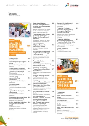 Ikhtisar 20202020 HighlightsLaporan ManajemenManagement ReportProfil PerusahaanCompany ProfileAnalisa & Diskusi ManajemenManagement Discussion & AnalysisPT Pertamina Hulu Energi2020 Laporan Tahunan TerintegrasiIntegrated Annual Report 6Daftar IsiTable of ContentDistribusi Kinerja EkonomiEconomic Performance DistributedPerubahan Peraturan Perundang-Undangan Yang Berpengaruh Signifikan Terhadap PerseroanChanges in Laws and Regulations Significantly Affecting the CompanyPerubahan Kebijakan Akuntansi yang Diterapkan Perusahaan Pada Tahun BukuAccounting Policy Changes Implemented by the Company in the Fiscal YearTingkat Kesehatan PerusahaanCompany Soundness Level158164226227244250252253255256258263264265273277277278284286288291291292156294Bab 04 Chapter 04ANALISA & DISKUSIMANAJEMENManagement Discussion & AnalysisPendahuluanIntroductionRapat Umum Pemegang SahamGeneral Meeting of ShareholdersDewan KomisarisBoard of CommissionersDireksiBoard of DirectorsRapat Dewan Komisaris dan DireksiMeeting of the Board of Commissioners and the Board of Directors296312324341354Bab 05 Chapter 05TATA KELOLA PERUSAHAANYANG BAIKGood Corporate GovernanceTinjauan UmumGeneral OverviewTinjauan Operasi per Segmen UsahaOperation Overview per Business SegmentTinjauan Kinerja KeuanganFinancial Performance OverviewLaporan Posisi Keuangan KonsolidasianConsolidated Statements of Financial PositionLaporan Laba Rugi KomprehensifComprehensive Profit and Loss StatementsLaporan Arus Kas KonsolidasianConsolidated Statement of Cash FlowsLaporan Rasio Keuangan KonsolidasianConsolidated Financial Ratio StatementKemampuan Membayar Utang dan Kolektibilitas PiutangSolvability and CollectibilityStruktur Modal dan Kebijakan Manajemen atas Struktur ModalCapital Structure and Management Policies on Capital StructureIkatan Material untuk Investasi Barang Modal dan Investasi Barang Modal yang DirealisasikanMaterial Commitment for Capital Goods Investment and Capital Goods Investment RealizedPerbandingan Antara Target Pada Awal Tahun Buku dengan Hasil yang Dicapai (Realisasi)Comparison Between the Target at the Beginning of The Fiscal Year and RealizationKebijakan Dividen dan Pembayaran DividenDividend Policy and Dividend PaymentInformasi dan Fakta Material yang Terjadi setelah Tanggal Laporan AkuntanMaterial Information and Facts Occurring After the Accountant Report DateProspek Usaha dan PemasaranBusiness Prospect and MarketingKinerja Entitas AnakSubsidiaries PerformanceProgram Kepemilikan Saham (ESOP/MSOP)Share Ownership Program (ESOP/MSOP)Realisasi Penggunaan Dana Hasil Penawaran UmumRealization of Public Offering Funds UseInformasi Transaksi Material Mengandung Benturan Kepentingan dan/atau AfilasiInformation on Material Transaction Containing Conflict of Interest and/or AffiliationInformasi Keberlangsungan UsahaBusiness Continuity InformationInformasi mengenai Investasi, Ekspansi, Divestasi, Akuisisi, Restrukturisasi Utang, Transaksi Afiliasi dan Transaksi Mengandung Benturan KepentinganInformation on Investment, Expansion, Divestment, Acquisition, Debt Restructuring, Affiliate Transactions and Transactions with Conflict of Interest