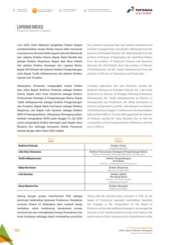Laporan ManajemenManagement ReportProfil PerusahaanCompany ProfileAnalisa & Diskusi ManajemenManagement Discussion & AnalysisIkhtisar 20202020 HighlightsPT Pertamina Hulu Energi2020 Laporan Tahunan TerintegrasiIntegrated Annual Report 60Juni 2020, telah dilakukan pergantian Direksi dengan memberhentikan empat Direksi karena telah memasuki masa pensiun dan pemindah tugasan yaitu Ibu Meidawati dari Jabatan Direktur Utama, Bapak Abdul Mutalib dari jabatan Direktur Eksplorasi, Bapak Said Reza Pahlevi dari jabatan Direktur Keuangan dan Layanan Bisnis, Bapak Afif Saifudin dari jabatan Direktur Pengembangan, serta Bapak Taufik Aditiyawarman dari jabatan Direktur Operasi dan Produksi.Selanjutnya Perseroan mengangkat empat Direksi baru yakni Bapak Budiman Parhusip sebagai Direktur Utama, Bapak John Hisar Simamora sebagai Direktur Perencanaan Strategis & Pengembangan Bisnis, Bapak Taufik Aditiyawarman sebagai Direktur Pengembangan dan Produksi, Bapak Medy Kurniawan sebagai Direktur Eksplorasi, dan Bapak Lelin Eprianto sebagai Direktur SDM & Penunjang Bisnis. Selanjutnya Pemegang saham kembali mengadakan RUPS pada tanggal 16 Juli 2020 untuk mengangkat Direktur Keuangan yaitu Bapak Harry Mozarta Zen sehingga komposisi Direksi Perseroan sampai dengan akhir tahun 2020 adalah:Nama NameJabatanPositionBudiman Parhusip Direktur UtamaPresident DirectorsJohn Hisar Simamora Direktur Perencanaan Strategis & Pengembangan BisnisDirector of Strategic Planning & Business DevelopmentTaufik Aditiyawarman Direktur Pengembangan & ProduksiDirector of Development & ProductionMedy Kurniawan Direktur EksplorasiDirector of ExplorationLelin Eprianto Direktur SDM & Penunjang BisnisDirector of Human Capital & Business SupportHarry Mozarta Zen Direktur KeuanganDirector of FinanceSeiring dengan proses transformasi PHE sebagai pemimpin Subholding Upstream Pertamina, Perubahan susunan Direksi ini diharapkan akan menjadi energi tambahan untuk mendorong kesuksesan proses transformasi dan meningkatkan kinerja Perusahaan dan Anak Usahanya sehingga dapat memperluas portofolio four Directors because they had entered retirement and transfer of assignments, namely Mrs. Meidawati from the position of President Director, Mr. Abdul Mutalib from the position of Director of Exploration, Mr. Said Reza Pahlevi from the position of Directorof Finance and Business Services, Mr. Afif Saifudin from the position of Director of Development, and Mr. Taufik Aditiyawarman from the position of Director of Operations and Production.Company appointed four new Directors, namely Mr. Budiman Parhusip as President Director, Mr. John Hisar Simamora as Director of Strategic Planning & Business Development, Mr. Taufik Aditiyawarman as Director of Development and Production, Mr. Medy Kurniawan as Director of Exploration, and Mr. Lelin Eprianto as Director of HR & Business Support. Furthermore, the shareholders held another GMS on 16 July 2020 appointed the Director of Finance, namely Mr. Harry Mozarta Zen so that the composition of the Company Board of Directors until the end of 2020 is:Along with the transformation process of PHE as the leader of Pertamina upstream subholding, hopefully the changes in the composition of the Board of Directors will provide additional energy to encourage the success of the transformation process and improve the performance of the Company and its Subsidiaries so that Laporan direksiBoard of Director%u2019s Report