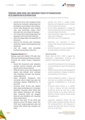 %u00bb Learning from Event to manage Incident Reporting and Investigation as part of learning for future system improvement.%u00bb Process Safety Management to manage the risks associated with the process hydrocarbon and asset integrity from the site.%u00bb Land Transportation Safety as part of driving safety risks management.%u00bb Office HSE as part of K3 management.%u00bb Observation and Intervention to create employee HSE culture through observations on workplace.%u00bb Audit and Inspection to ensure consistency of the implementation of the K3LL system.%u2022 Operational SafetySeveral efforts by PHE in 2020 to support the development, implementation, monitoring and evaluation of the Security Program, through:%u00bb Security Risk Assessment to find out mapping of security threats occur both from internal and external.%u00bb PSRM (Pertamina Security Risk Management) activities undertaken to mitigate risk based on asset mapping in each work area.%u00bb Security Management System to ensure all work areas are compliant and implement the provisions of PERKAPOLRI No. 24 the year 2007.%u00bb Community Based Security, is a activities in order to empower and build community involvement around the work area in asset security activities, so can reduce conflict and distraction security caused by society around the operating area.%u00bb Cooperation Agreement between TNI and POLRI, namely cooperation between PHE and TNI institutions/POLRI in the framework of securing vital objects the national oil and gas sector as an state asset.%u00bb Learning from Event untuk mengelola Incident Reporting dan Investigation sebagai bagian dari pembelajaran untuk perbaikan sistem kedepan.%u00bb Process Safety Management untuk mengelola risiko yang berhubungan dengan proses hydrocarbon dan asset integrity dari lapangan.%u00bb Land Transportation Safety sebagai bagian dari pengelolaan risiko keselamatan berkendara.%u00bb Office HSE sebagai bagian dari pengelolaan K3 Perkantoran. %u00bb Observasi dan Intervensi untuk menciptakan budaya K3LL pekerja melalui pengamatan pada tempat kerja.%u00bb Audit dan Inspeksi untuk memastikan konsistensi dari penerapan sistem K3LL.%u2022 Pengamanan Operasi [403-7]Beberapa upaya telah dilakukan PHE pada tahun 2020 untuk mendukung pengembangan, penerapan, monitoring dan evaluasi Program Pengamanan, melalui:%u00bb Security Risk Assessment untuk mengetahui pemetaan ancaman keamanan yang terjadi baik dari internal maupun eksternal.%u00bb PSRM (Pertamina Security Risk Management) kegiatan yang dilakukan untuk memitigasi risiko berdasarkan pemetaan aset dimasingmasing wilayah kerja.%u00bb Sistem Manajemen Pengamanan untuk memastikan seluruh wilayah kerja patuh dan menerapkan ketentuan PERKAPOLRI No. 24 tahun 2007.%u00bb Community Based Security yaitu kegiatan dalam rangka pemberdayaan dan membangun keterlibatan masyarakat sekitar wilayah kerja dalam kegiatan pengamanan aset, sehingga dapat mengurangi konflik dan gangguan keamanan yang disebabkan oleh masyarakat sekitar wilayah operasi.%u00bb Perjanjian Kerja Sama TNI dan POLRI yaitu kerjasama Antara PHE dengan institusi TNI/POLRI dalam rangka pengamanan objek vital nasional sektor MIGAS yang merupakan aset negara.TANGGUNG JAWAB SOSIAL DAN LINGKUNGAN TERKAIT KETENAGAKERJAAN,KESELAMATAN DAN KESEHATAN KERJA Social and Environment Responsibility Related to Employment, Occupational Health and SafetyLaporan ManajemenManagement ReportProfil PerusahaanCompany ProfileAnalisa & Diskusi ManajemenManagement Discussion & AnalysisIkhtisar 20202020 HighlightsPT Pertamina Hulu Energi2020 Laporan Tahunan TerintegrasiIntegrated Annual Report 600