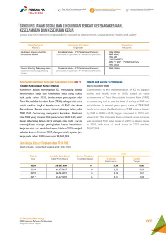 Health and Safety Performance Work Accident RateCommitment to the implementation of K3 to support safety and health work in 2020, based on value achievement of Total Recordable Incident Rate (TRIR) as measuring tool to see the level of safety at PHE and subsidiaries. In several years years, value of TRIR PHE tends to increase. the Realization of TRIR value achieved by PHE in 2020 is 0.29, bigger compared to 2019 with value 0.20. This indicates there accident cases increase was recorded from nine cases in 2019 to eleven cases in 2020, with total of work hours in 2020 reached 38,067,689.Kinerja Keselamatan Kerja dan Kesehatan Kerja [403-9]Tingkat Kecelakaan Kerja TercatatKomitmen dalam menerapkan K3 menunjang kinerja keselamatan kerja dan kesehatan kerja yang cukup baik pada tahun 2020, berdasarkan pencapaian nilai Total Recordable Incident Rate (TRIR) sebagai alat ukur untuk melihat tingkat keselamatan di PHE dan Anak Perusahaan. Secara umum dalam beberapa tahun, nilai TRIR PHE Cenderung mengalami kenaikan. Realisasi nilai TRIR yang dicapai PHE pada tahun 2020 0,29, lebih besar dibanding tahun 2019 dengan nilai 0,20. Hal ini menunjukkan adanya peningkatan kasus kecelakaan kerja tercatat dari sembilan kasus di tahun 2019 menjadi sebelas kasus di tahun 2020, dengan total capaian jam kerja pada tahun 2020 mencapai 38,067,689.Jam Kerja, Kasus Terekam dan TRIR PHEWork Hours, Recorded Cases and PHE TRIRTahunYearJumlah Jam KerjaTotal Work HoursKasus TerekamRecorded CasesTRIRRealisasi RealizationTargetTarget2020 38.067.689 11 0,29 0,862019 44.475.827 9 0,20 0,932018 32.104.091 5 0,16 1,012017 34.579.231 6 0,17 1,30PenghargaanAwardsLembaga PemberiOrganizerPenerimaRecipient Upstream Improvement & Innovation AwardDirektorat Hulu %u2013 PT Pertamina (Persero)Directorate of Upstream - PT Pertamina (Persero)%u2022 PHE ONWJ%u2022 PHE WMO%u2022 PHE JM%u2022 JOB P-MEPTS%u2022 BOB PT BSP %u2013 Pertamina Hulu%u2022 PHE OSESForum Sharing Teknologi HuluUpstream Technology Sharing ForumDirektorat Hulu %u2013 PT Pertamina (Persero)Directorate of Upstream - PT Pertamina (Persero)%u2022 PHE ONWJTANGGUNG JAWAB SOSIAL DAN LINGKUNGAN TERKAIT KETENAGAKERJAAN,KESELAMATAN DAN KESEHATAN KERJA Social and Environment Responsibility Related to Employment, Occupational Health and SafetyTata Kelola Perusahaan yang BaikGood Corporate GovernanceTanggung Jawab Sosial PerusahaanCorporate Social ResponsibilityLaporan Keuangan KonsolidasianConsolidated Financial ReportPT Pertamina Hulu Energi2020 Laporan Tahunan TerintegrasiIntegrated Annual Report 605