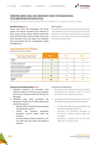 Work AccidentDuring 2020, PHE targeted zero fatality with the total limit work accident by 35 incident cases were recorded, with realization to the end of 2020 there were 34 recorded incidents. From the cases occured, one work accident is fatal and the employee died.Commitment To Health Work 1. Monitoring and recording to the reporting of workers and partners who experience cases of Covid-19 both Confirmation Cases, Cured, and Died.2. Prevention and handle the suspected Covid-19 by the implementation of promotive and preventive.%u2022 Creating work system procedures related to the prevention and handle of Covid-19.%u2022 Promotion and prevention campaigns of the spread of Covid-19 through health talk, broadcast.%u2022 Screening on employees prior to work from office also for workers on site.Kecelakaan Kerja [403-9]Selama tahun 2020, PHE menargetkan nihil fatality dengan total batasan kecelakaan kerja sebanyak 35 kasus insiden tercatat, dengan realisasi sampai akhir tahun 2020 telah terjadi 34 kasus insiden tercatat. Dari kasus kecelakaan kerja yang terjadi, satu kecelakaan kerja yang bersifat fatal dan mengakibatkan pekerja meninggal dunia.Insiden Kecelakaan Kerja PHE [403-9]PHE Work Accident IncidentsJenis Kasus Kecelakaan KerjaTypes of Work Accideng Cases 2020 2019 2018FatalityFatality 0 1 0Last Time Incident (LTI)Last Time Incident (LTI) 0 0 1Restricted Work Day Case (RWDC)Restricted Work Day Case (RWDC) 4 5 1Medical Treatment Case (MTC)Medical Treatment Case (MTC) 7 3 3First Aid Case (FAC)First Aid Case (FAC) 23 11 9JumlahTotal 34 20 14Komitmen Pada Kesehatan Kerja [403-10]1. Melakukan monitoring dan pencatatan untuk pelaporan pekerja dan mitra kerja yang mengalami kasus Covid-19 baik Kasus Konfirmasi, Sembuh, dan Meninggal. 2. Melakukan upaya dalam pencegahan dan penanganan suspek Covid-19 dengan implementasi promotif dan preventif. %u2022 Membuat Sistem Tata Kerja terkait pencegahan dan penanganan Covid-19.%u2022 Promosi dan kampanye pencegahan penyebaran Covid-19 melalui health talk, broadcast.%u2022 Screening pekerja sebelum pelaksanaan work from office juga untuk pekerja yang bekerja di lapangan. TANGGUNG JAWAB SOSIAL DAN LINGKUNGAN TERKAIT KETENAGAKERJAAN,KESELAMATAN DAN KESEHATAN KERJA Social and Environment Responsibility Related to Employment, Occupational Health and SafetyLaporan ManajemenManagement ReportProfil PerusahaanCompany ProfileAnalisa & Diskusi ManajemenManagement Discussion & AnalysisIkhtisar 20202020 HighlightsPT Pertamina Hulu Energi2020 Laporan Tahunan TerintegrasiIntegrated Annual Report 606